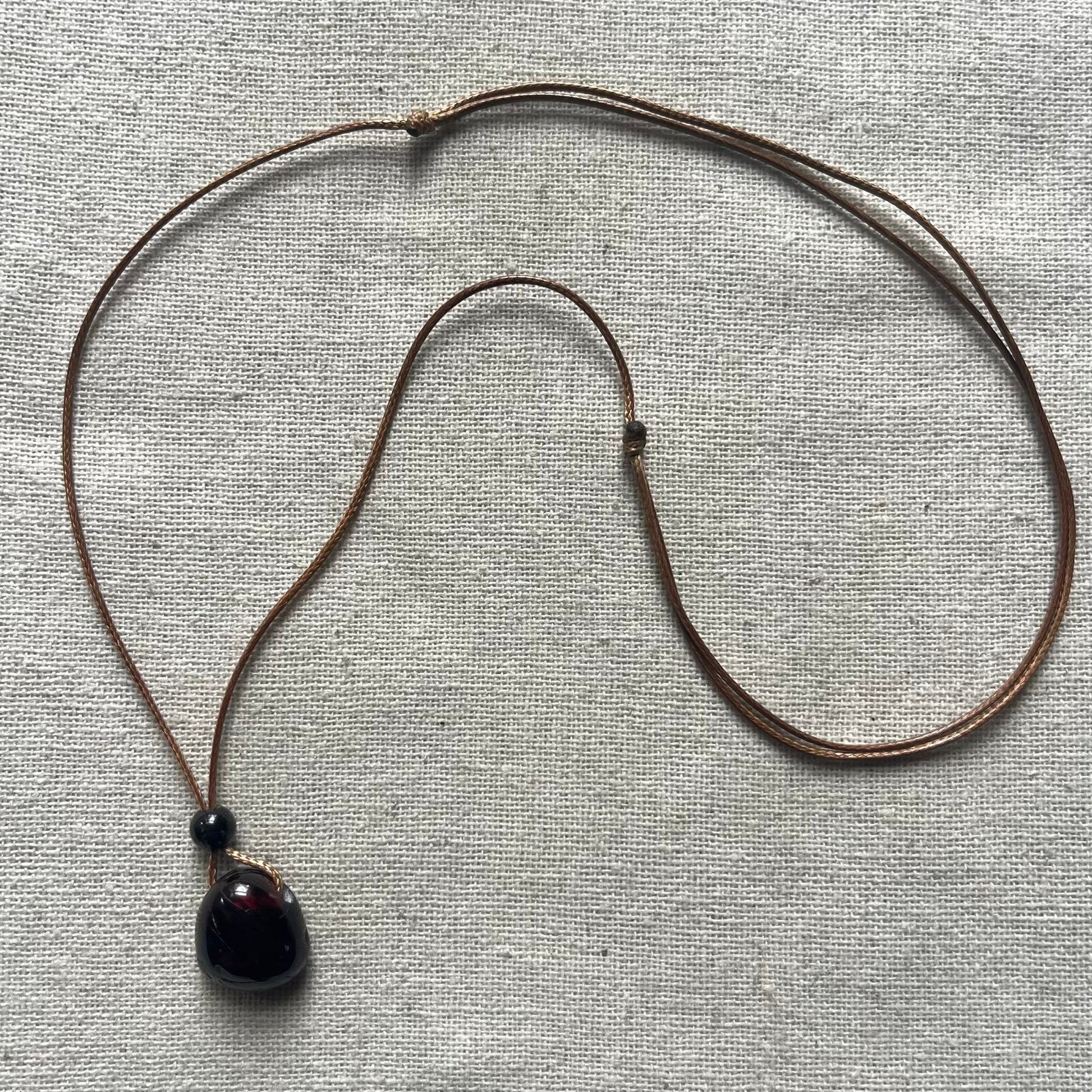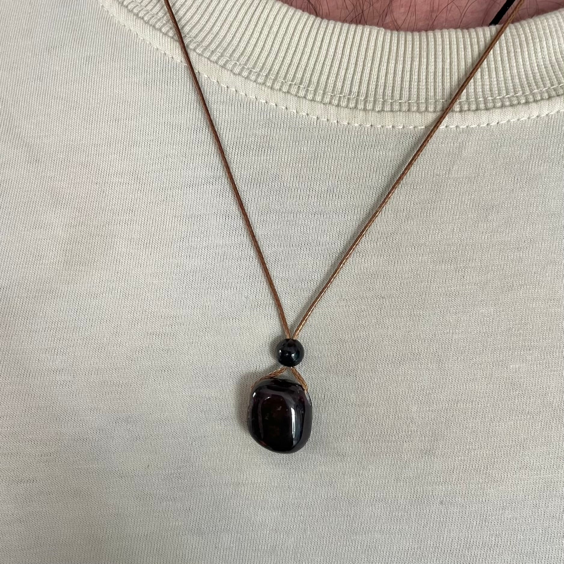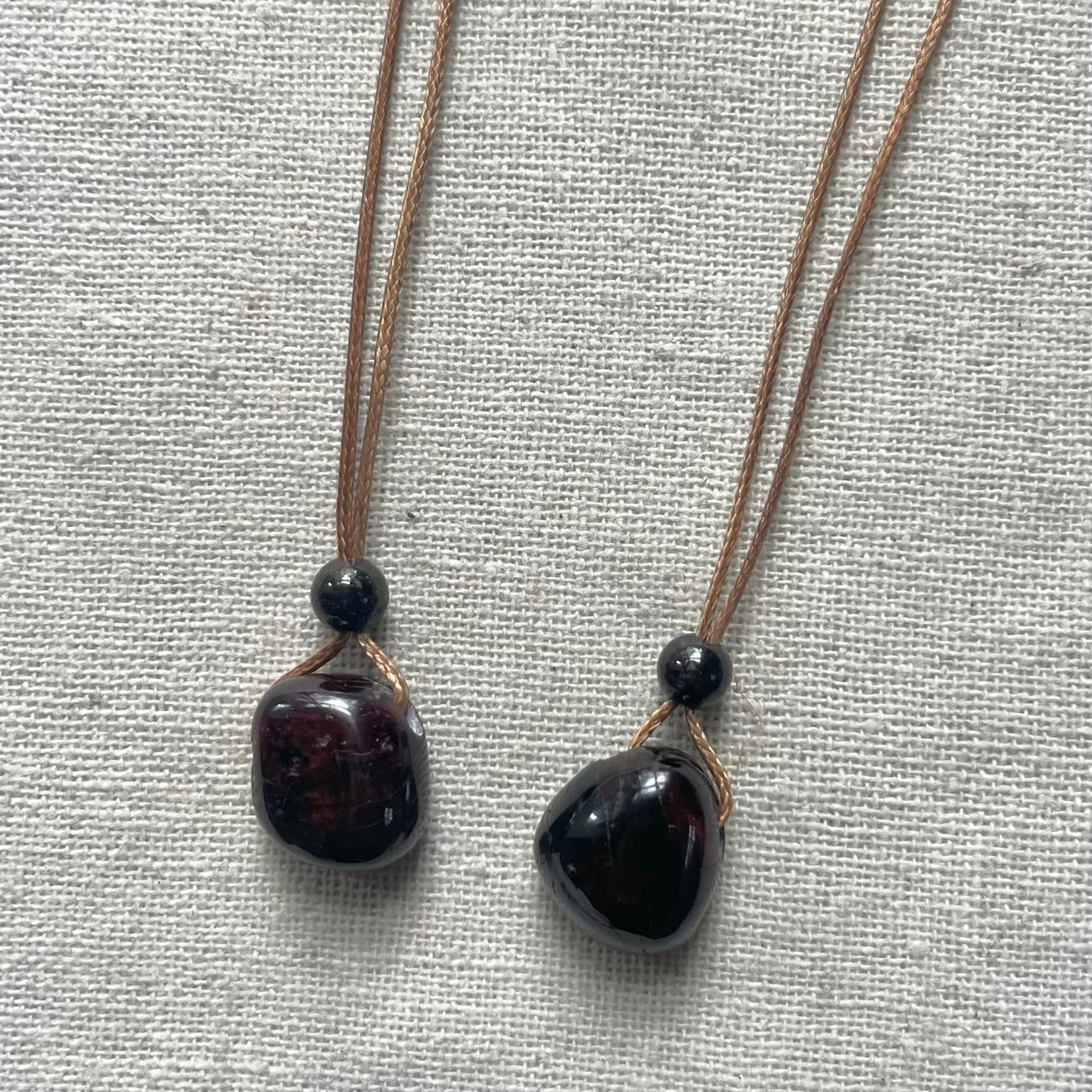 MADE WITH: A high grade polished Garnet pendant approx 1.8cm in size with a 6mm Garnet bead on an adjustable 33inch brown cord necklace. This pendant makes a striking everyday piece or a meaningful gift for anyone drawn to crystals of transformation and abundance.