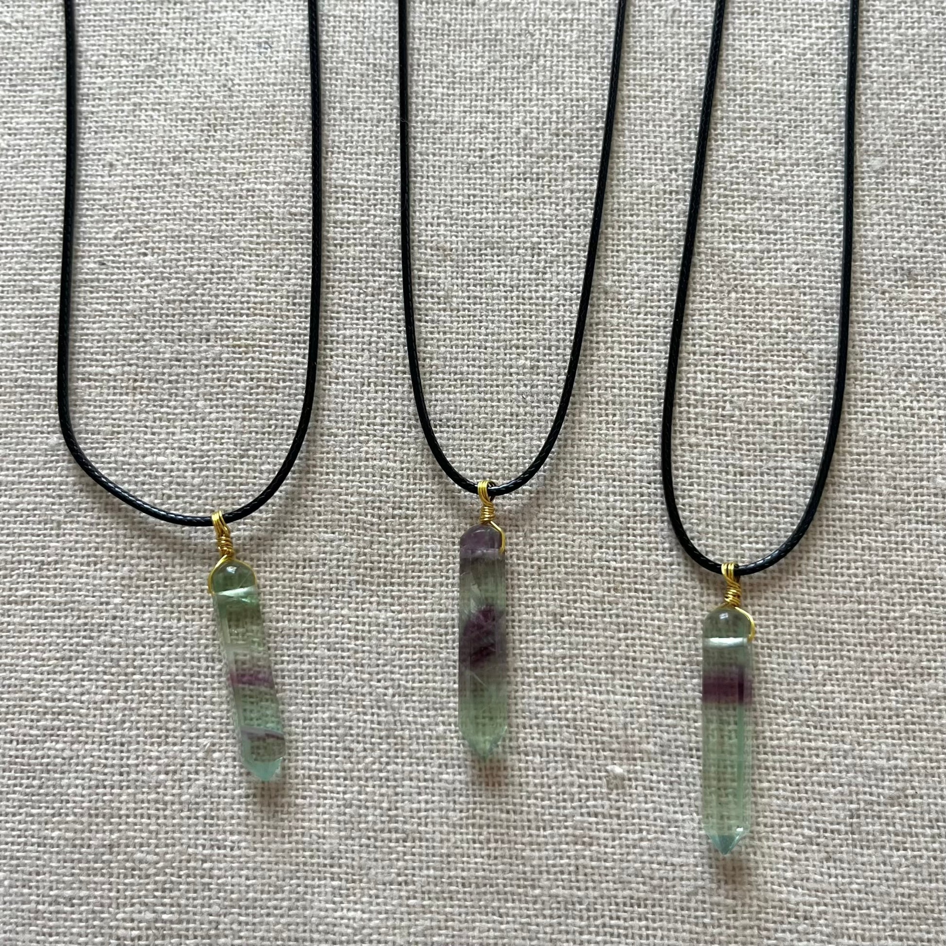 MADE WITH: A Fluorite crystal point pendant approx 2.5cm in size, elegantly wrapped in gold-plated wire and suspended on an adjustable 33-inch black cord. Each pendant’s natural variations make every piece uniquely beautiful.