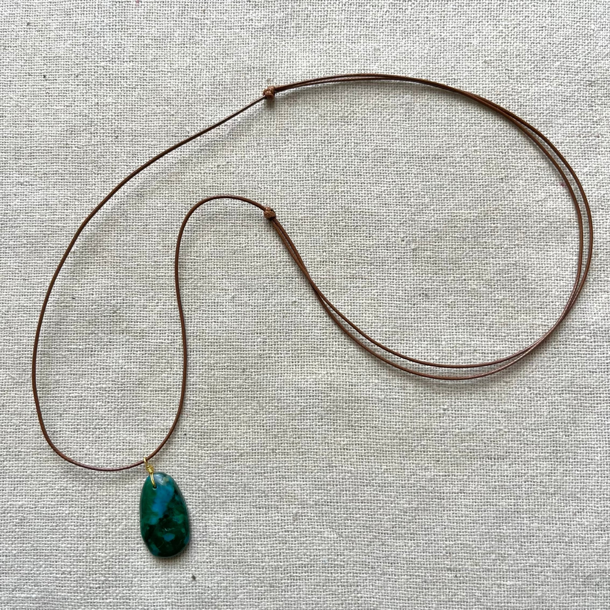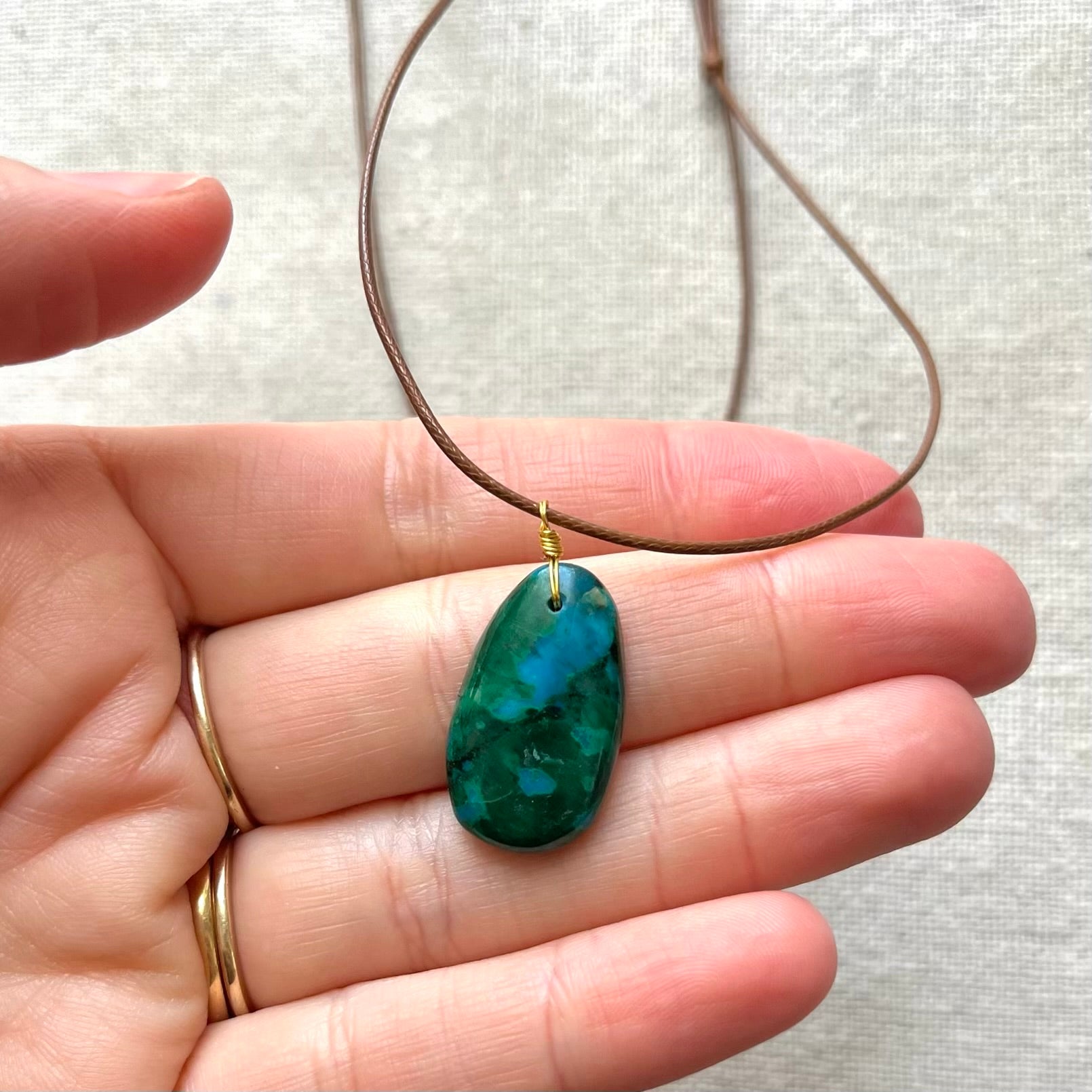 MADE WITH: A high grade gold wire wrapped Malachite Chrysocolla pendant approx 2.5cm in size on an adjustable 33inch brown cord necklace. This pendant makes a striking everyday piece or a meaningful gift for anyone drawn to crystals of transformation and abundance.