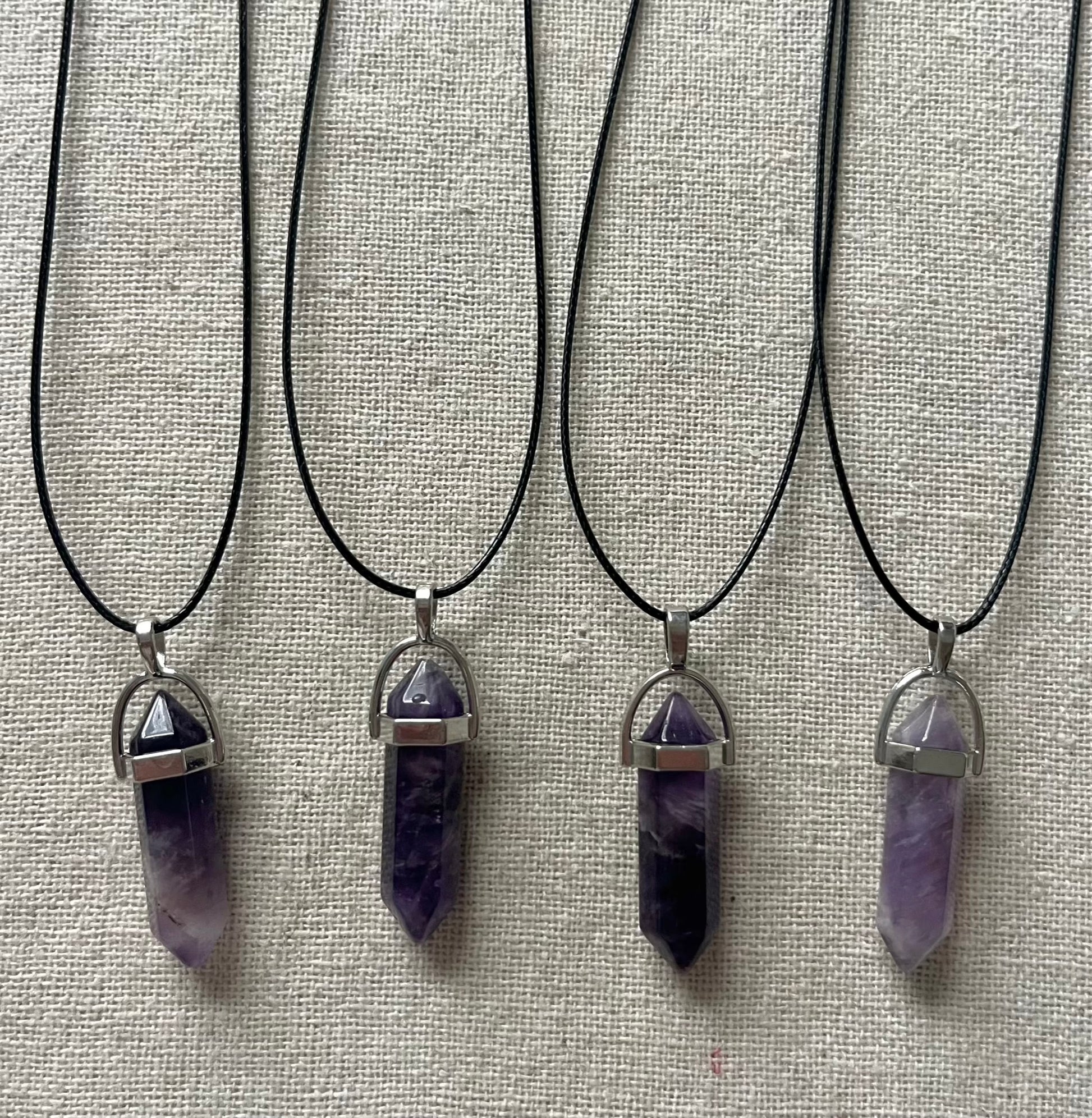 MADE WITH: A 3cm Amethyst point crystal set in a silver-plated casing, on an adjustable 33-inch black cord. Each pendant is unique, with slight variations in colour due to its natural formation.
