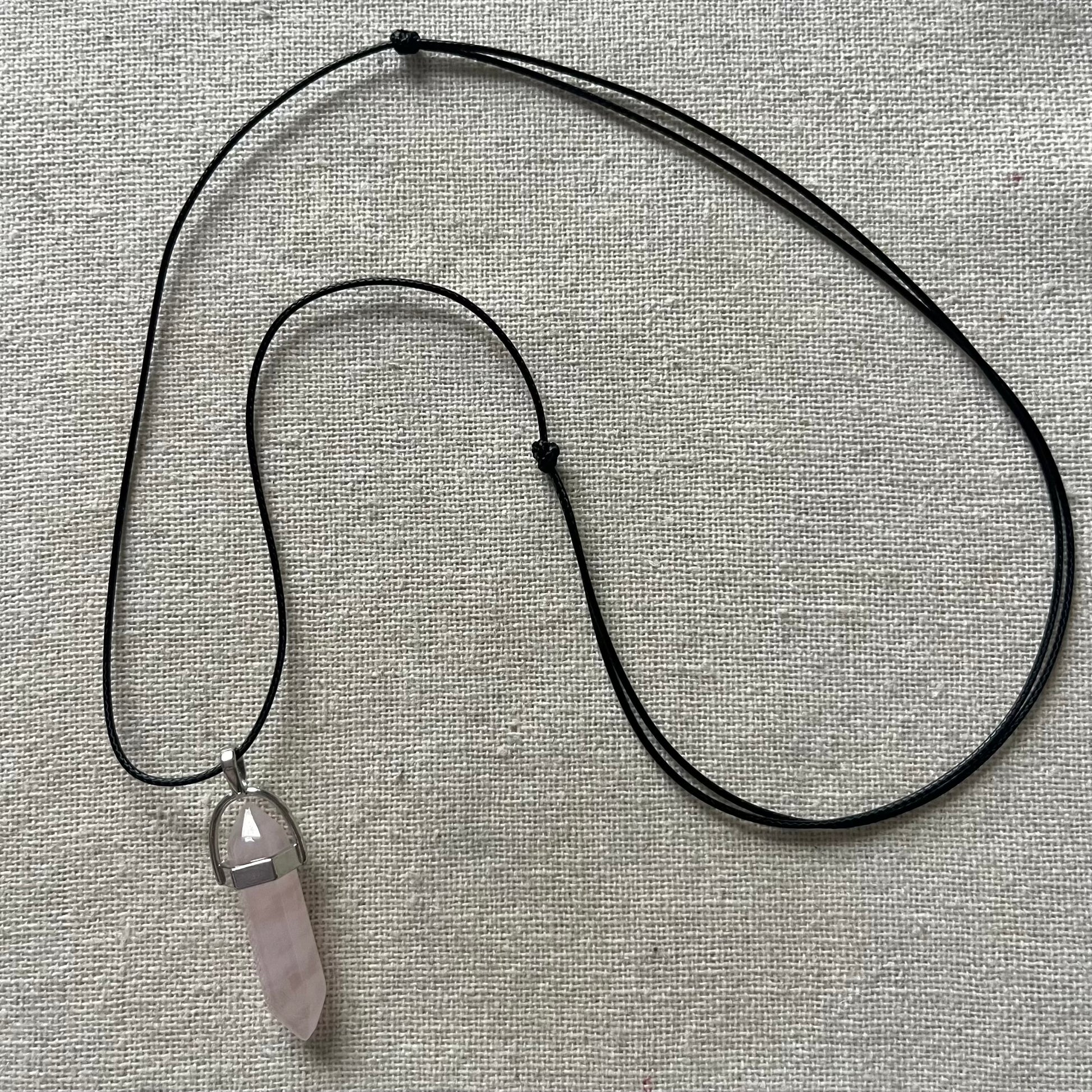 MADE WITH: A 3cm Rose Quartz point crystal set in a silver-plated casing, on an adjustable 33-inch black cord. Each pendant is unique, with slight variations in colour due to its natural formation.
