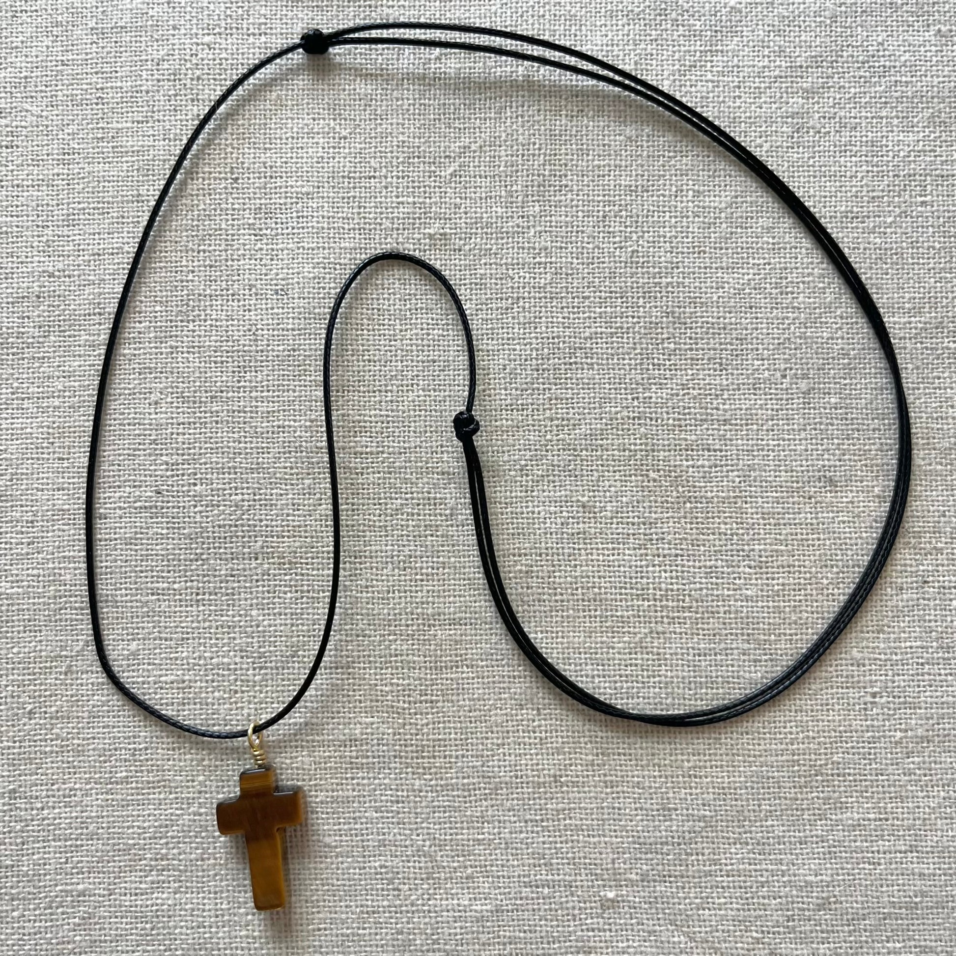 MADE WITH: A 2cm Tiger Eye cross crystal wrapped in gold-plated wire and suspended on an adjustable 33-inch black cord. Each pendant’s natural variations make every piece uniquely beautiful.