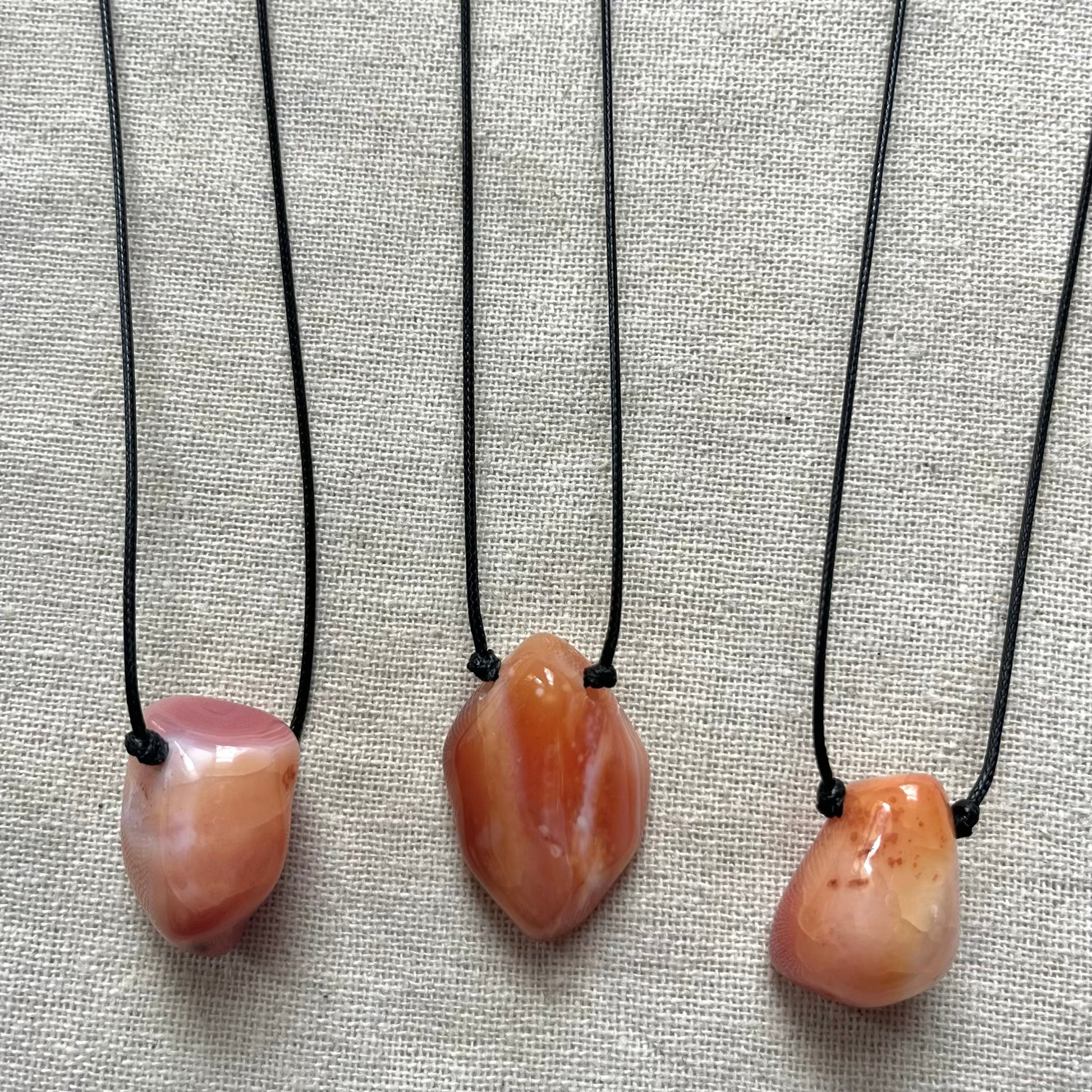 MADE WITH: A high grade polished Peach Agate pendant approx 2.5cm in size on an adjustable 33inch black cord necklace. This pendant makes a striking everyday piece or a meaningful gift.