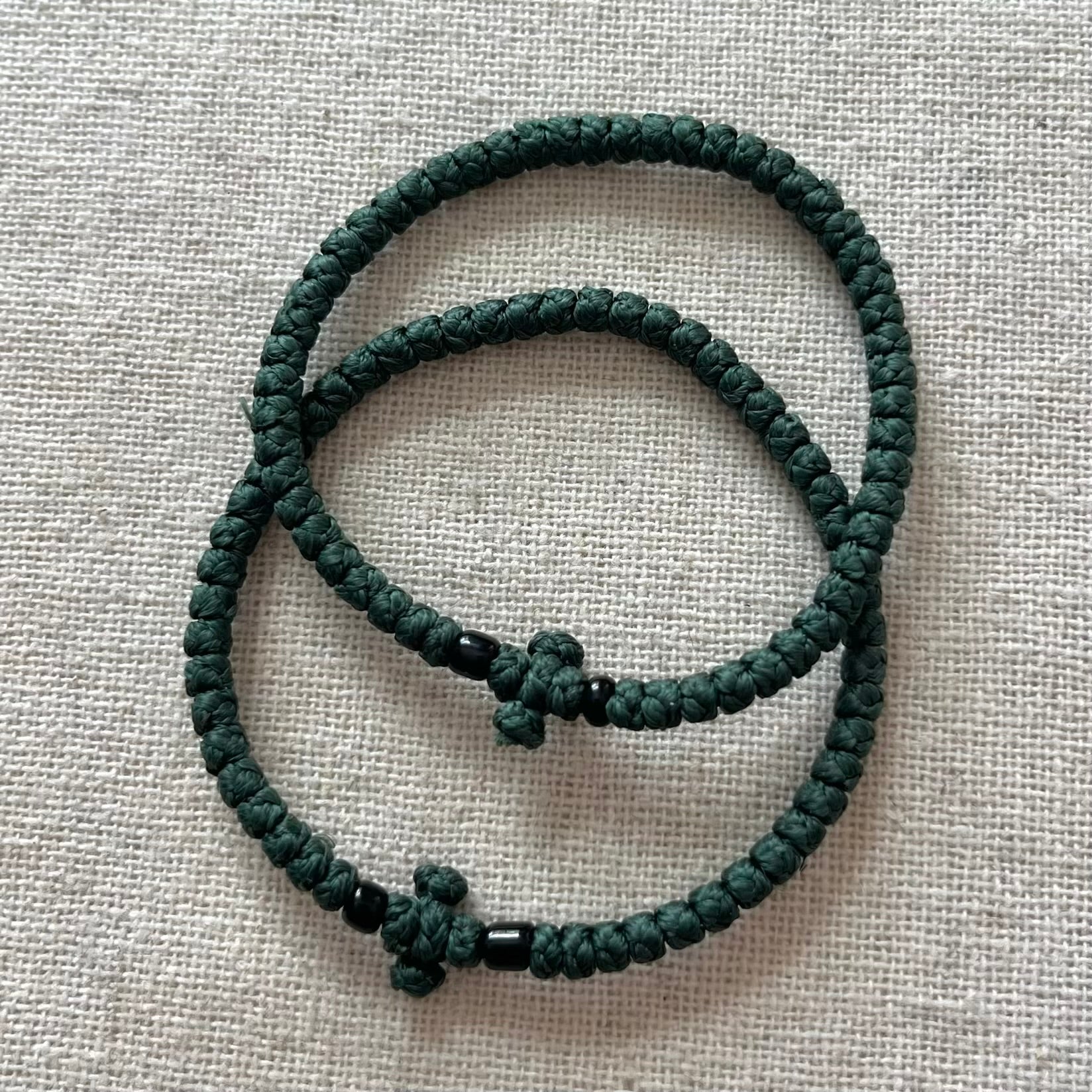 MADE WITH: Komboskini green wax cord bracelet with black beads.