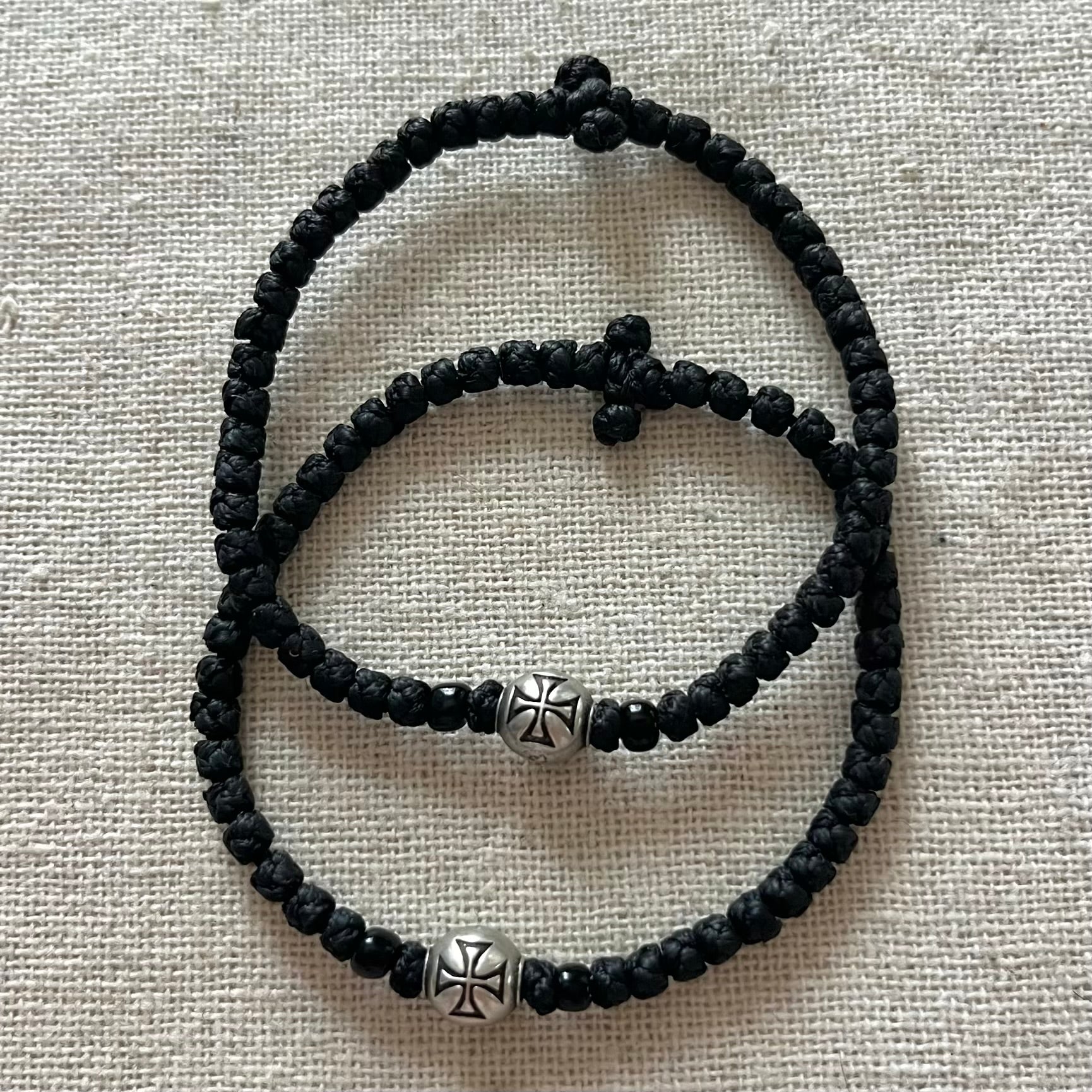 MADE WITH: Komboskini black wax cord bracelet with a round 8mm silver cross centre bead and black beads.