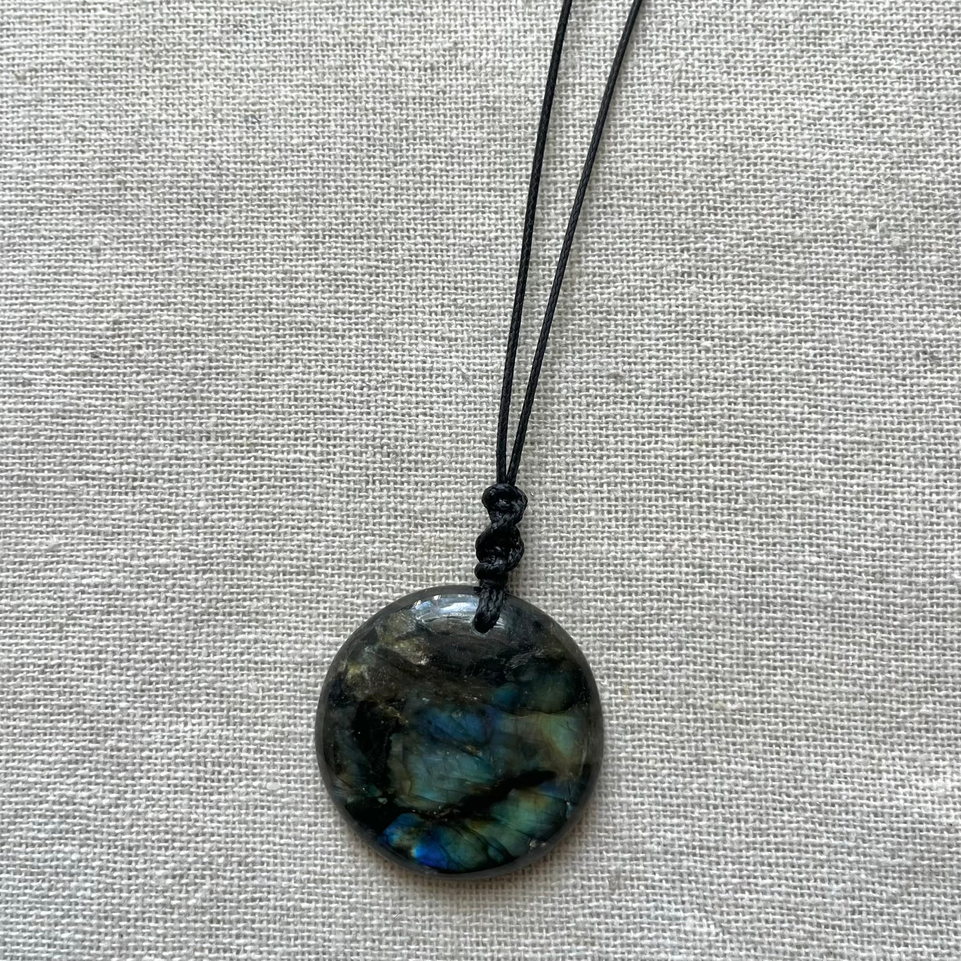 MADE WITH: A high grade circle Labradorite pendant approx 3.5 x 3.5cm in size on an adjustable 33inch black cord necklace. This pendant makes a mystical everyday piece or a thoughtful gift for anyone drawn to crystals of intuition and transformation.