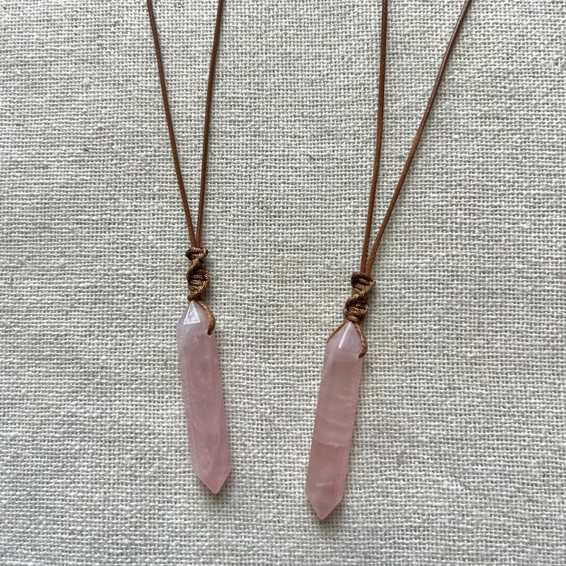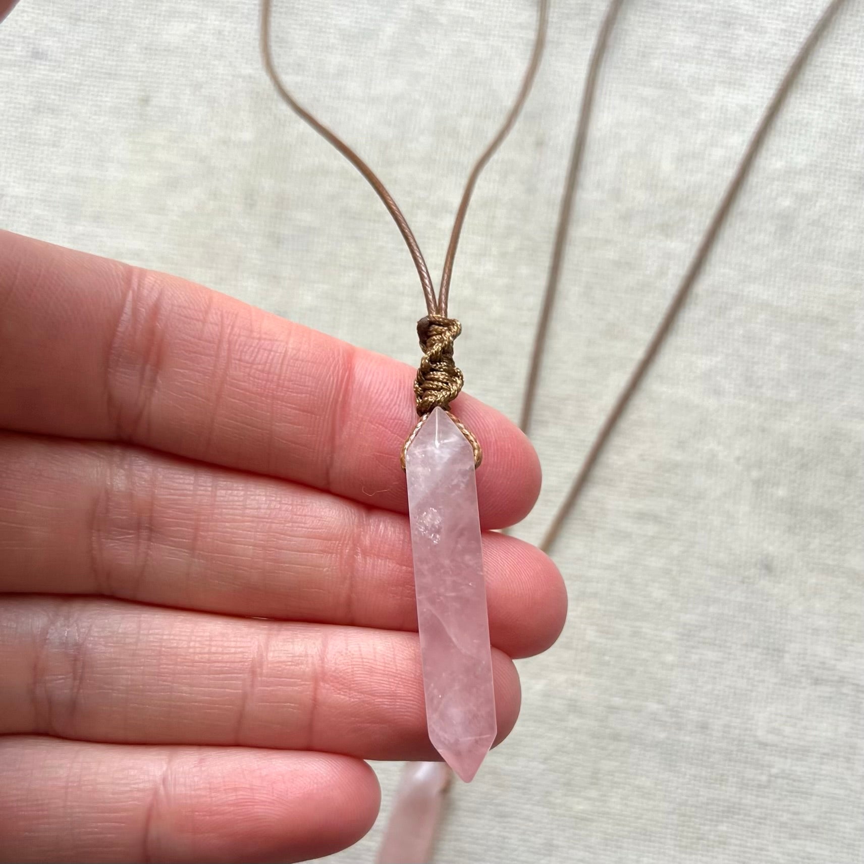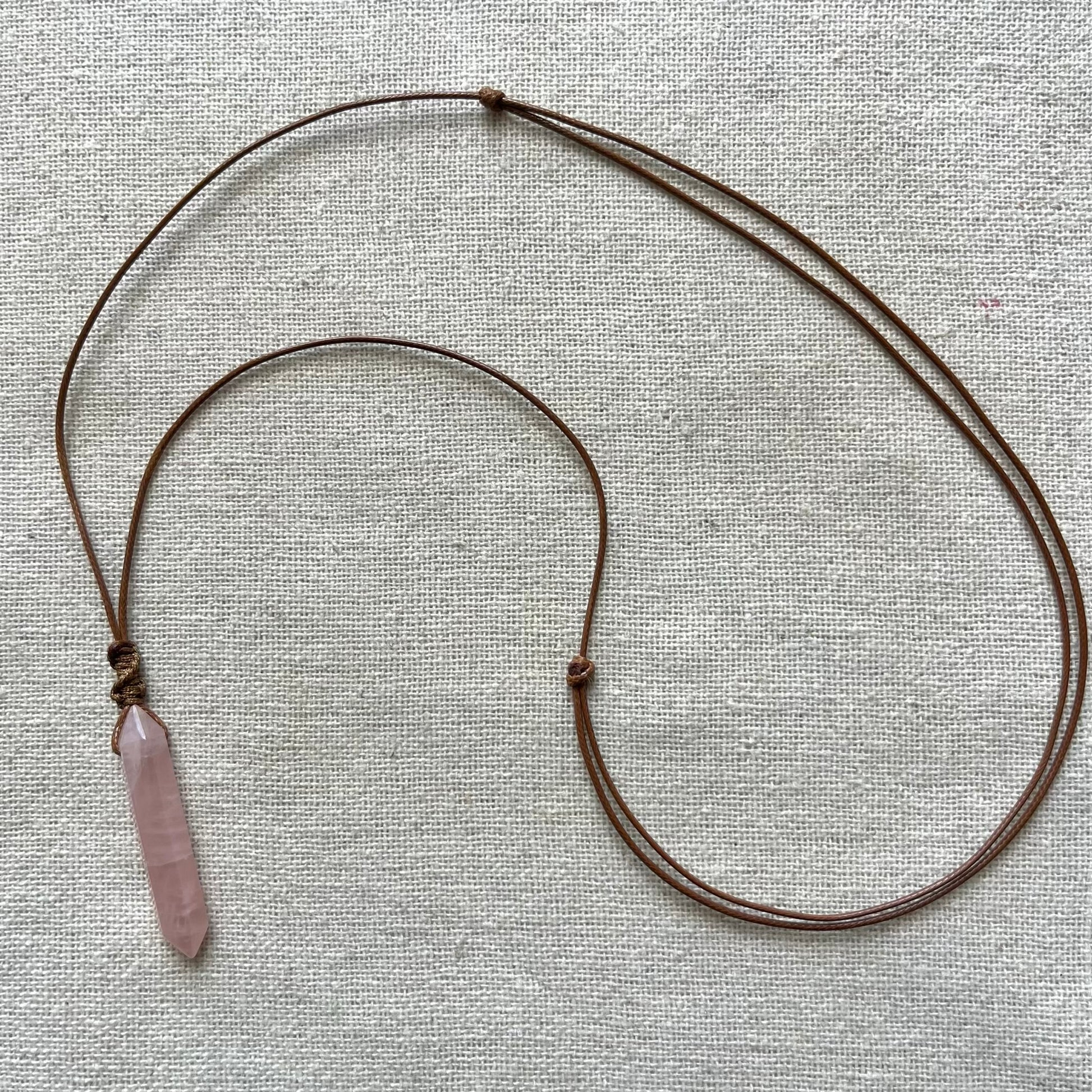 MADE WITH: A Rose Quartz point pendant approx 3.8cm in size hand strung on an adjustable 33inch brown cord.