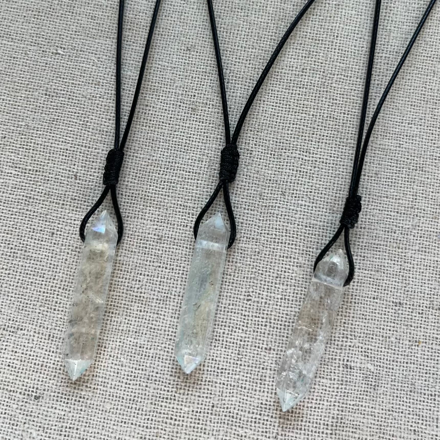MADE WITH: A clear Quartz point approximately 4cm in size, strung on an adjustable 33-inch black cord. Each stone is one-of-a-kind, shaped naturally by the elements and hand-selected for its grounding energy.