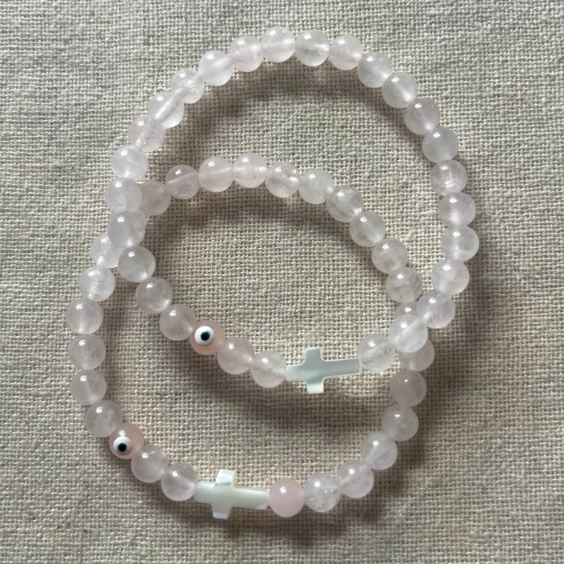 MADE WITH: Handcrafted by us with love and intention, this bracelet features high-quality, natural 6mm rose quartz beads, a pink evil eye and white pearl cross centrepiece strung on a durable silicon elastic.