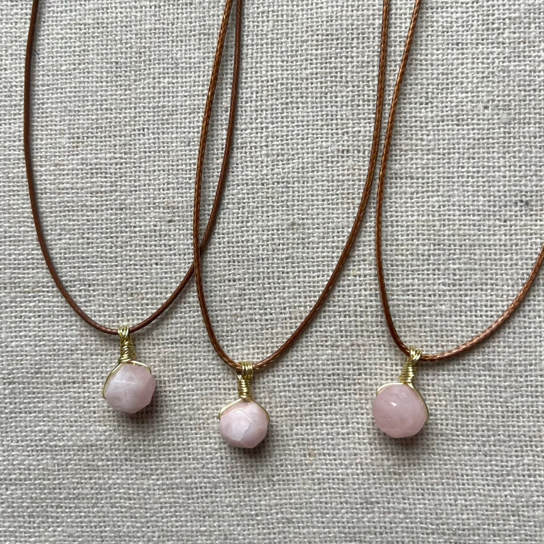 MADE WITH: A faceted pink morganite crystal approx 8mm in size, elegantly wrapped in gold-plated wire and suspended on an adjustable 33-inch brown cord. Each pendant’s natural variations make every piece uniquely beautiful.