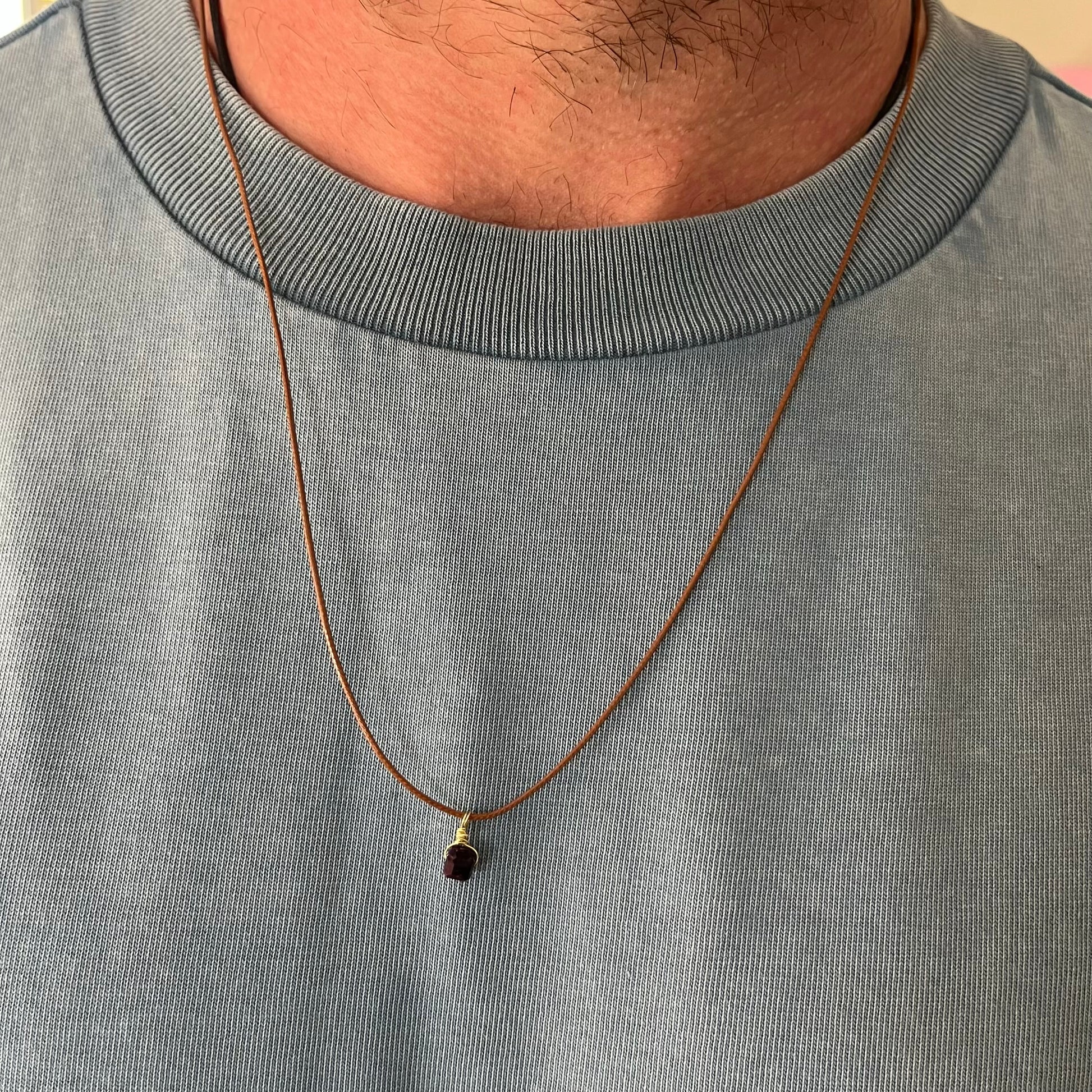 MADE WITH: A faceted Purple Tiger Eye crystal approx 6mm in size, elegantly wrapped in gold-plated wire and suspended on an adjustable 33-inch brown cord. Each pendant’s natural variations make every piece uniquely beautiful.