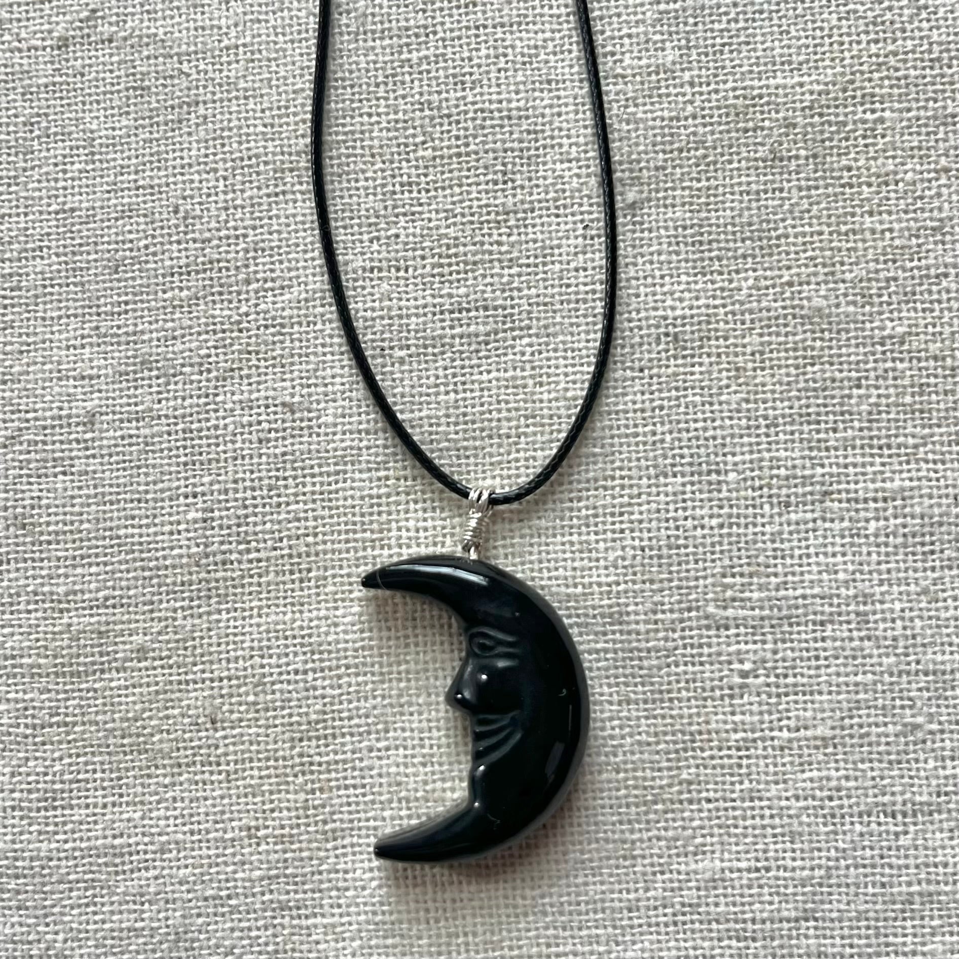 MADE WITH: A stunning hand-carved moon face Obsidian pendant approx 2.5cm x 2cm in size on an adjustable 33inch black cord necklace. This pendant makes a striking everyday piece or a meaningful gift.