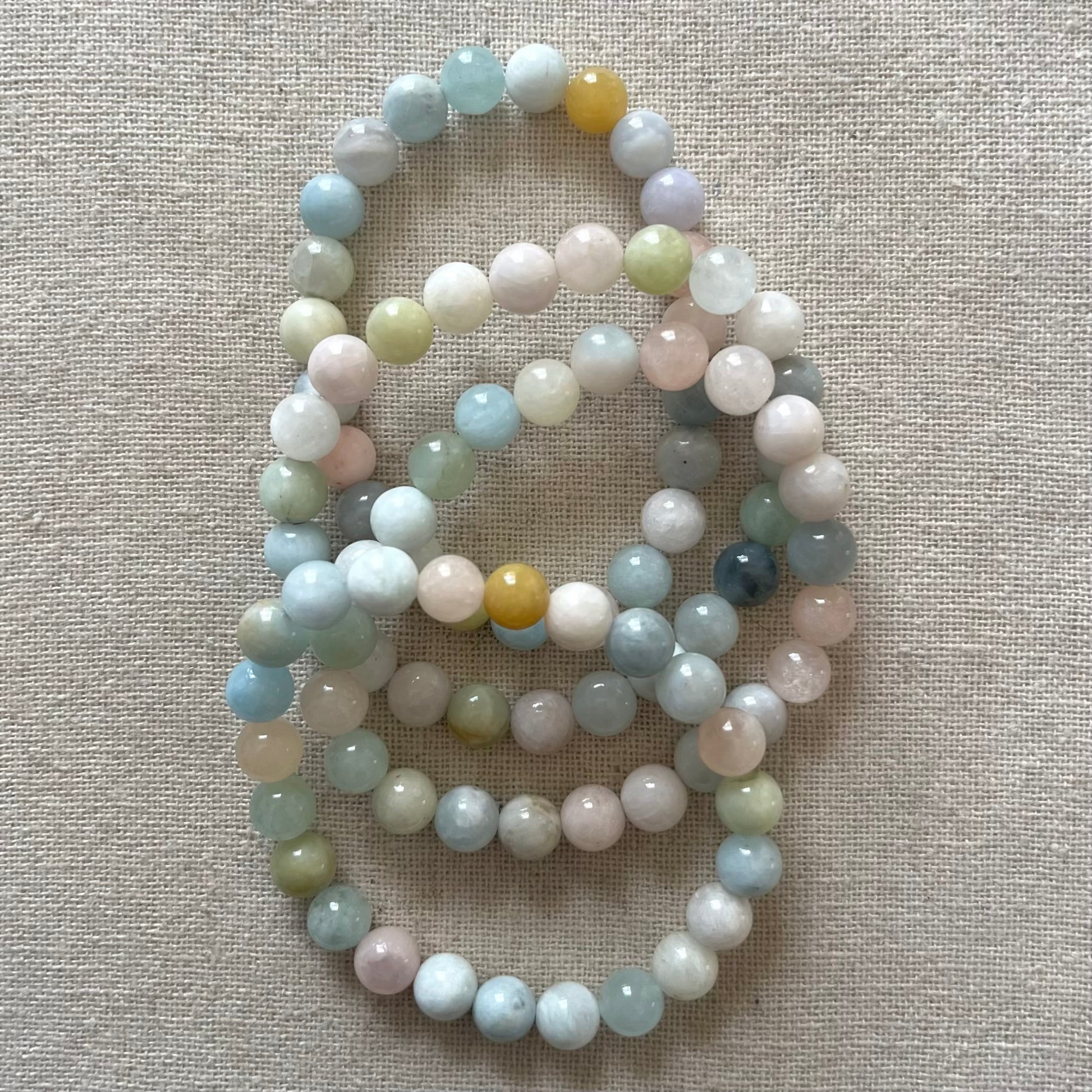 MADE WITH: Handcrafted by us with love and intention, this bracelet features high-quality, natural 8mm Morganite beads strung on a durable silicon elastic.