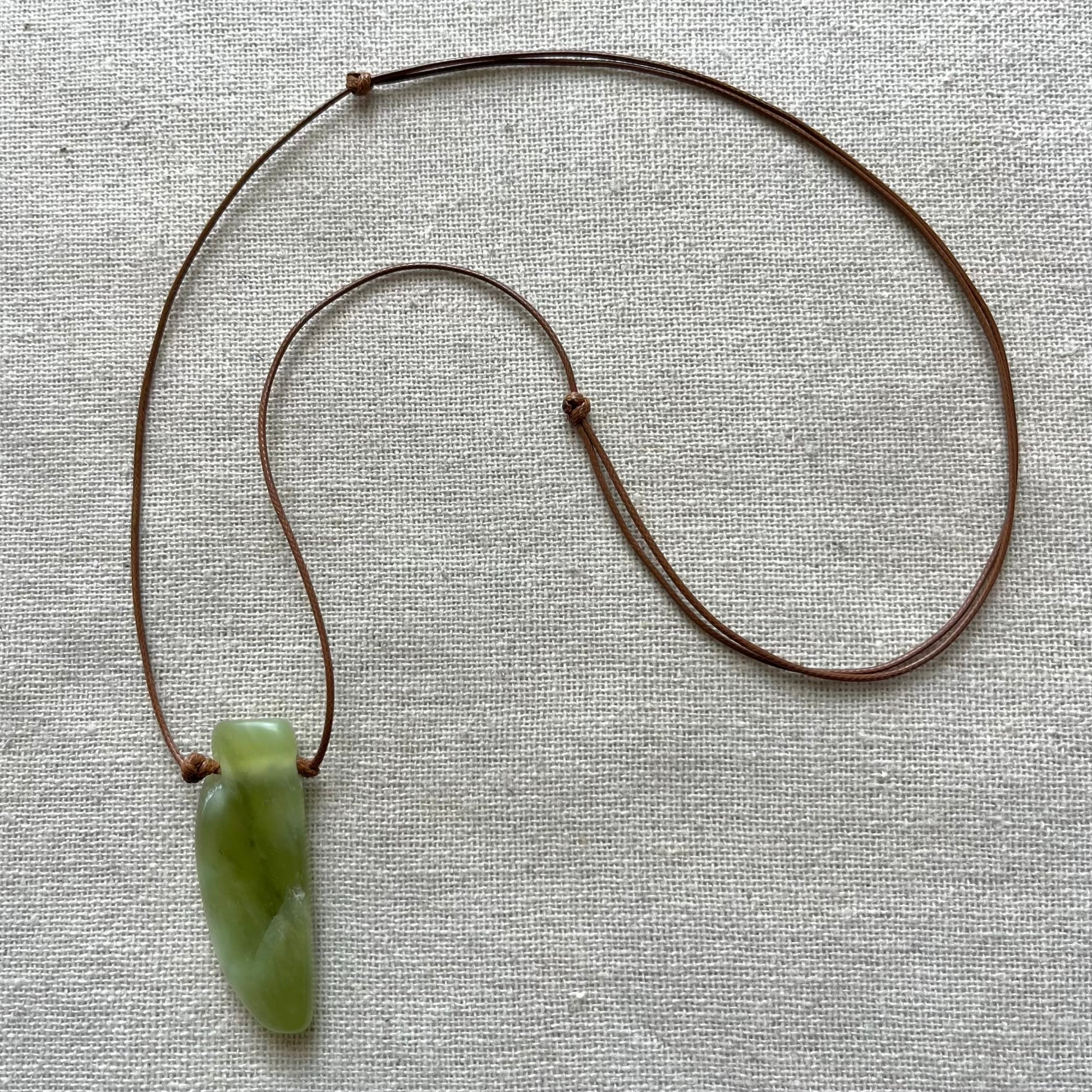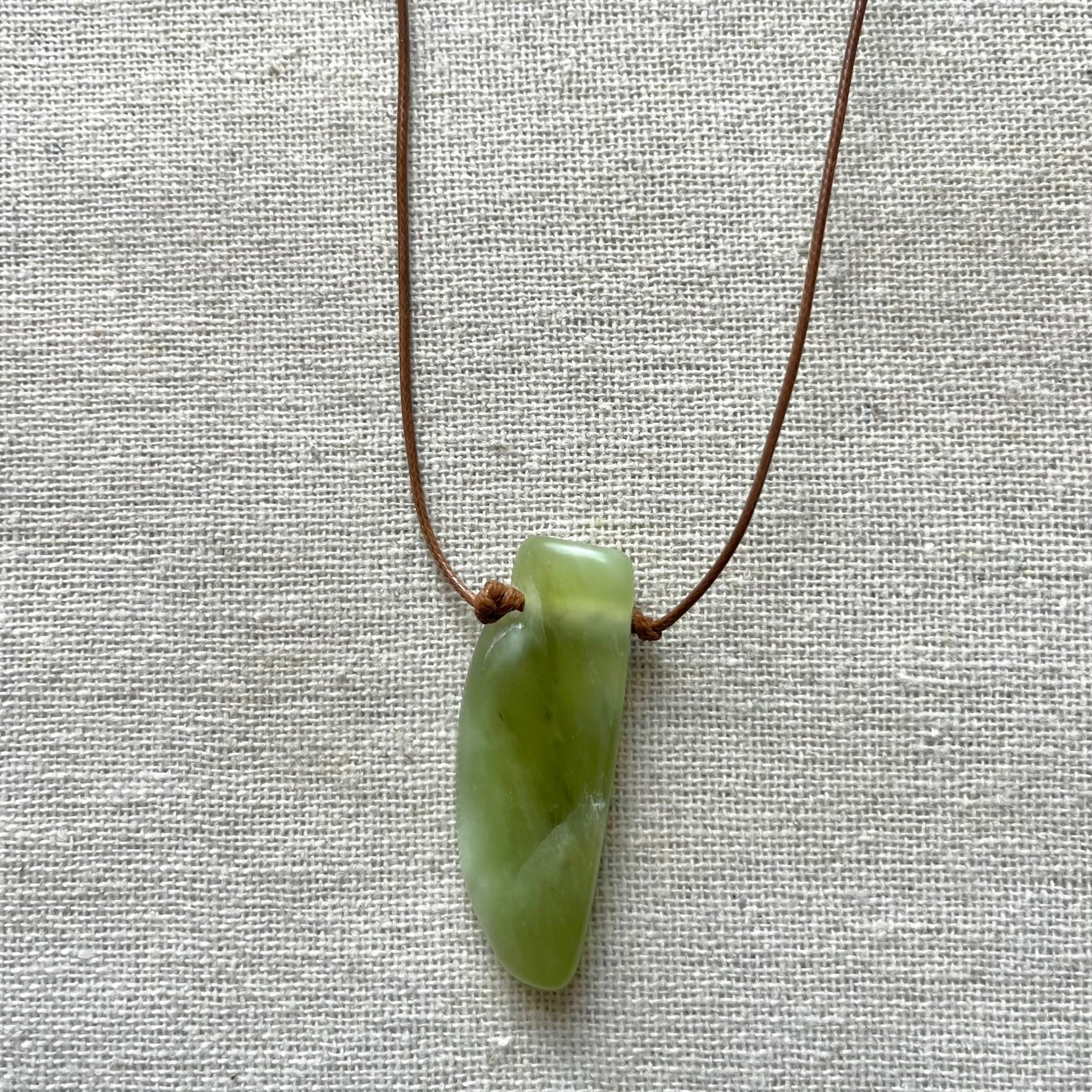 MADE WITH: A beautiful one-off new jade pendant approximately 4.5cm in size on an adjustable brown cord necklace.