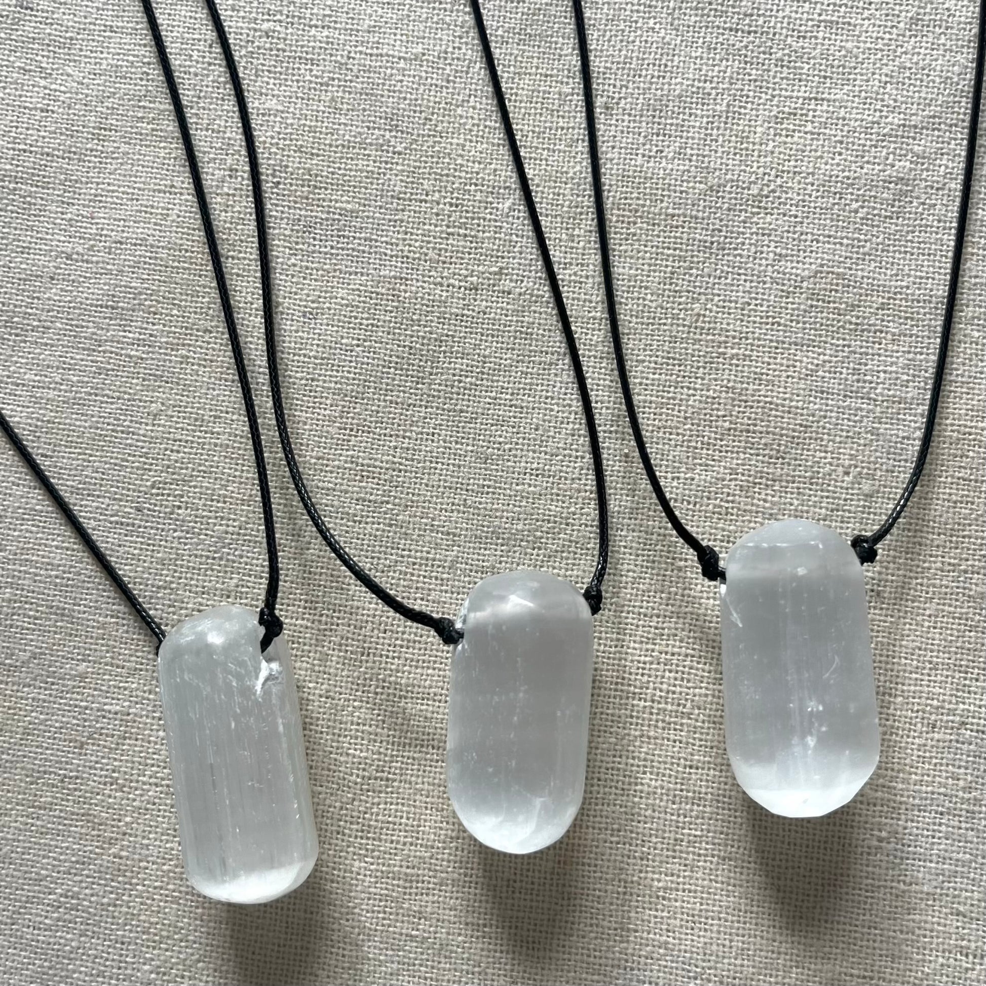 MADE WITH: A high grade polished Selenite pendant approx 3cm x 2cm x 2cm in size on an adjustable 33inch black cord necklace. This pendant makes a striking everyday piece or a meaningful gift.