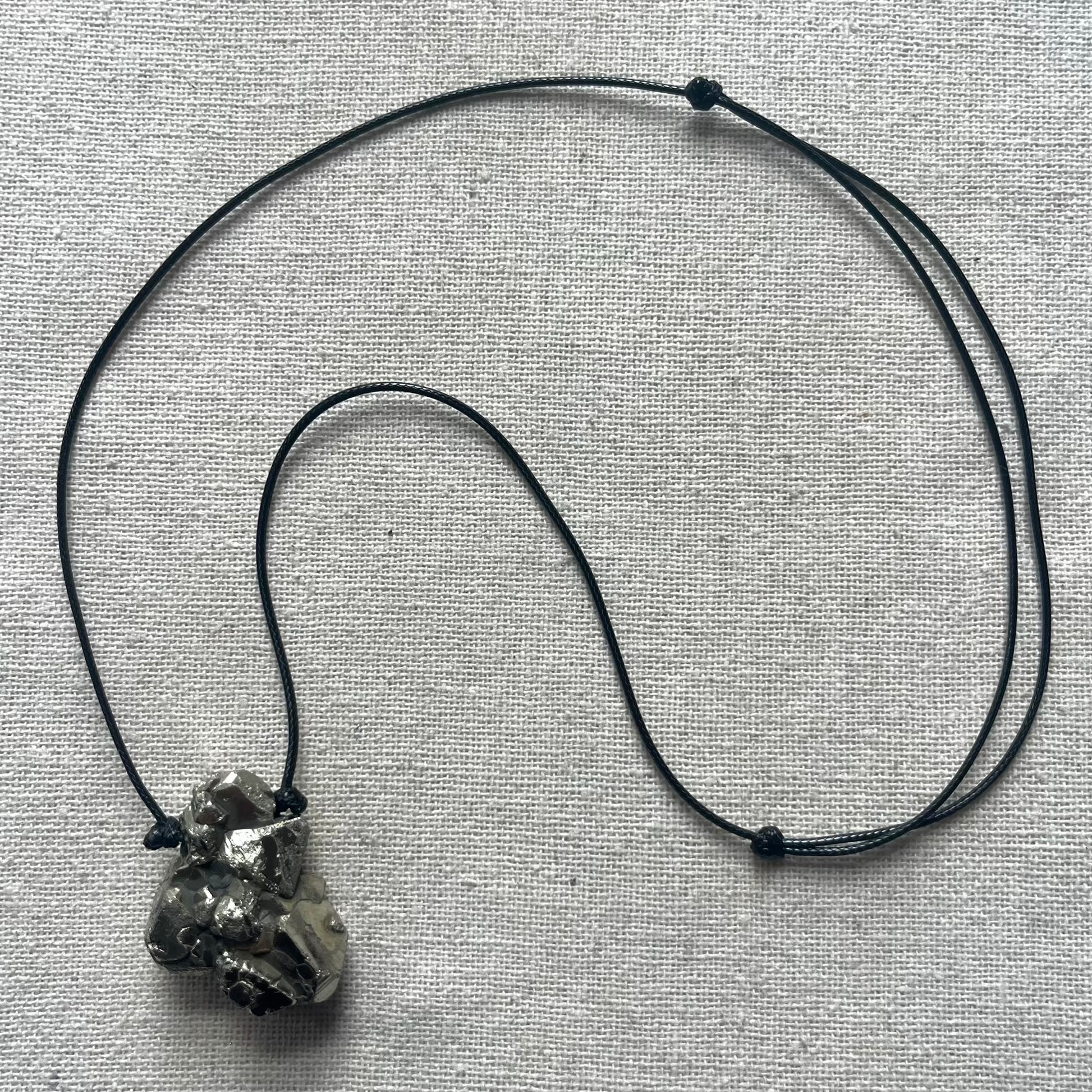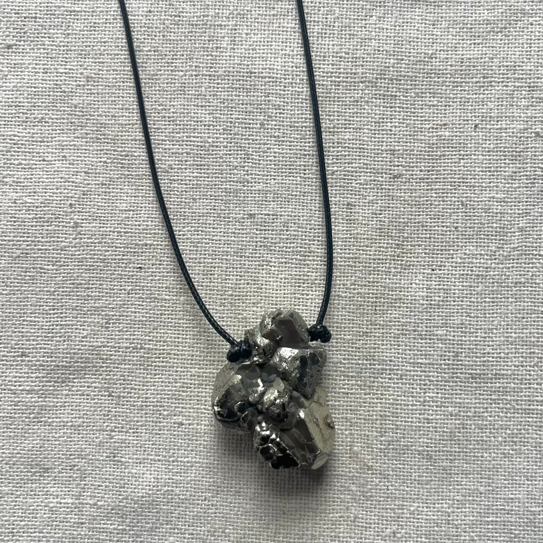 MADE WITH: A high grade Pyrite pendant approx 3cm x 2.5cm in size on an adjustable 33inch black cord necklace. This pendant makes a mystical everyday piece or a thoughtful gift.