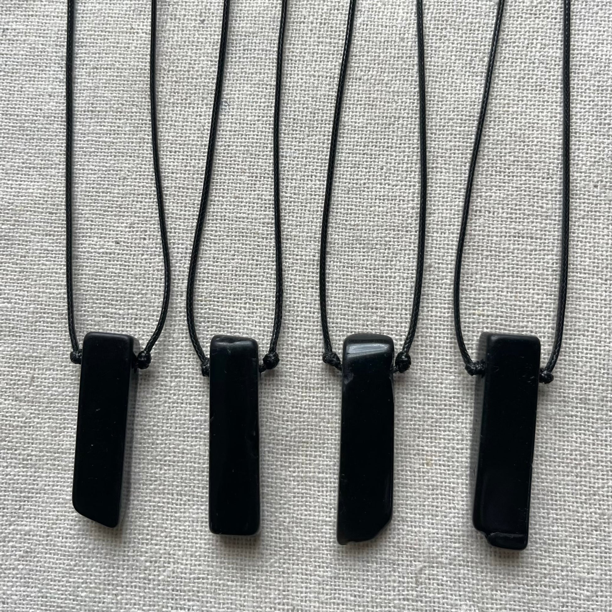 MADE WITH: A polished irregular shaped Obsidian pendant approx 3.5-4cm in size on an adjustable 33inch black cord necklace. This pendant makes a striking everyday piece or a meaningful gift for anyone drawn to crystals of transformation and abundance.