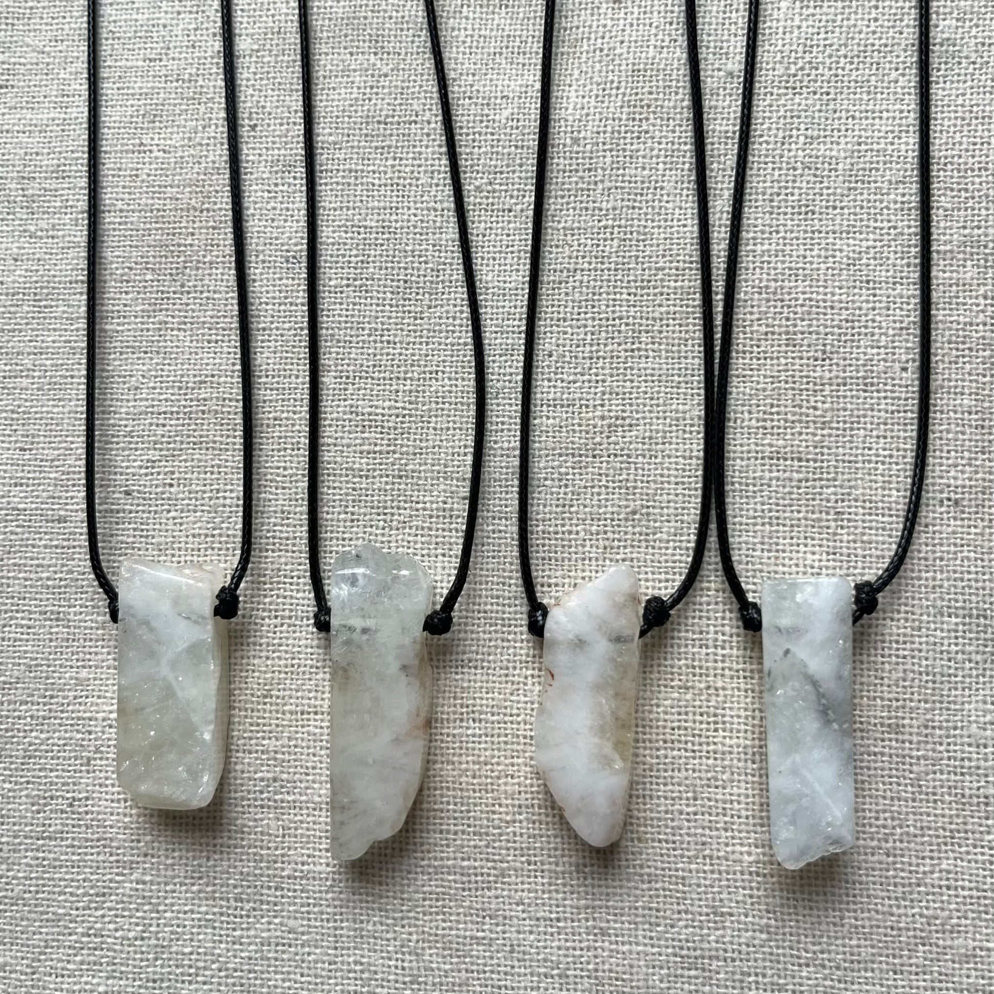 MADE WITH: A polished irregular shaped Clear Quartz pendant approx 3.5-4cm in size on an adjustable 33inch black cord necklace. This pendant makes a striking everyday piece or a meaningful gift for anyone drawn to crystals of transformation and abundance.