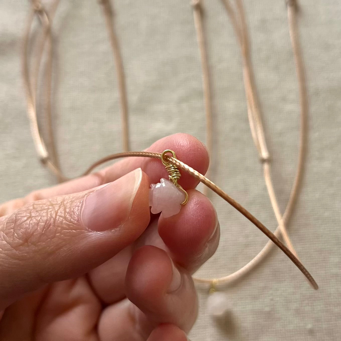 MADE WITH: A handcrafted, gold wire wrapped rose quartz rose pendant approx 6mm in size on an adjustable 33inch brown cord.
