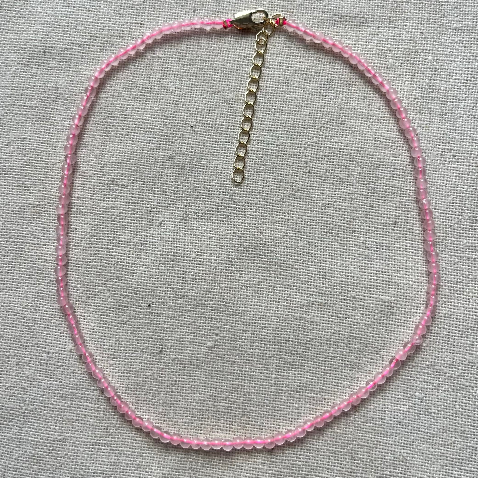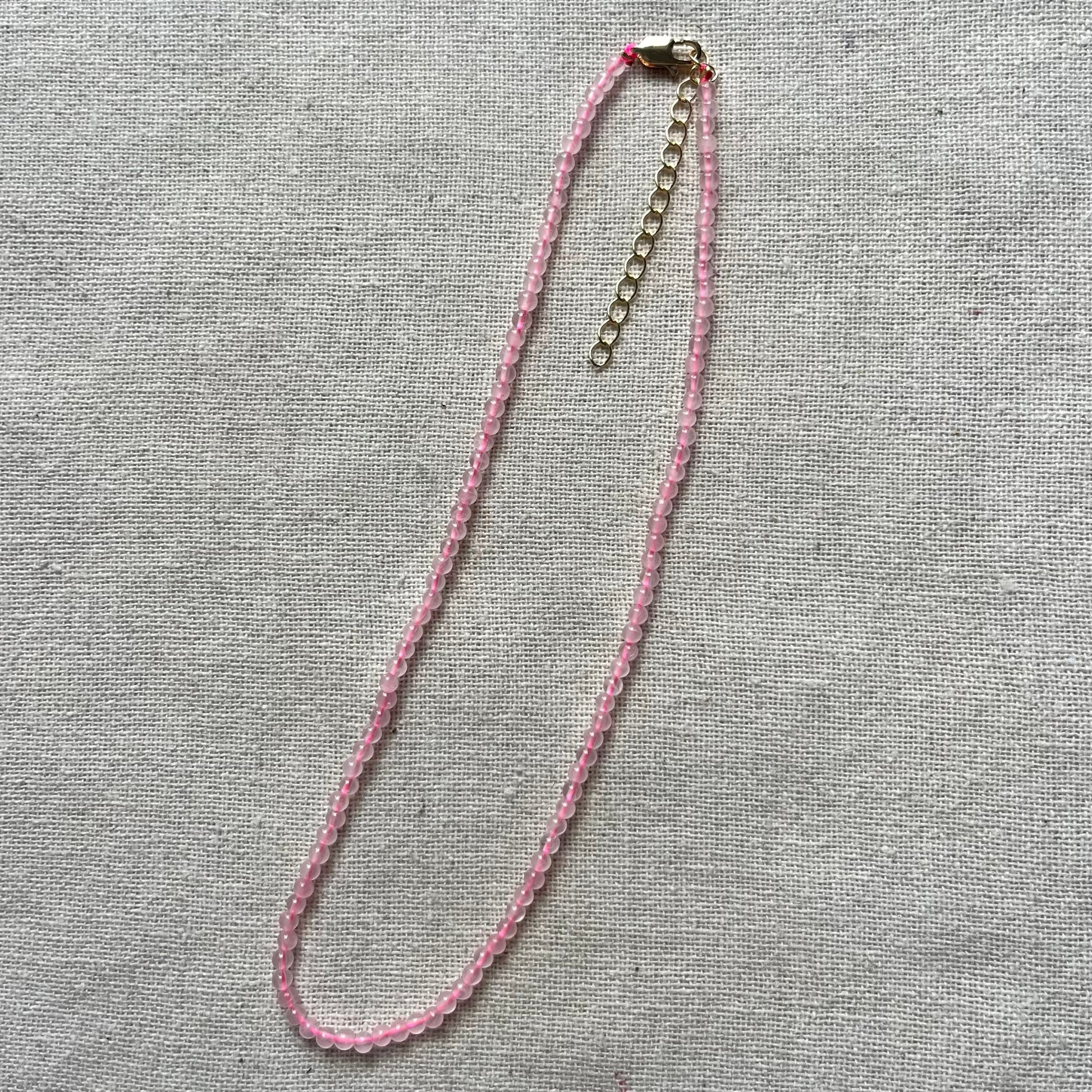 MADE WITH: Handcrafted by us with love and intention, this necklace features high-quality, natural 3mm Rose Quartz beads finished with a 14k gold filled clasp.