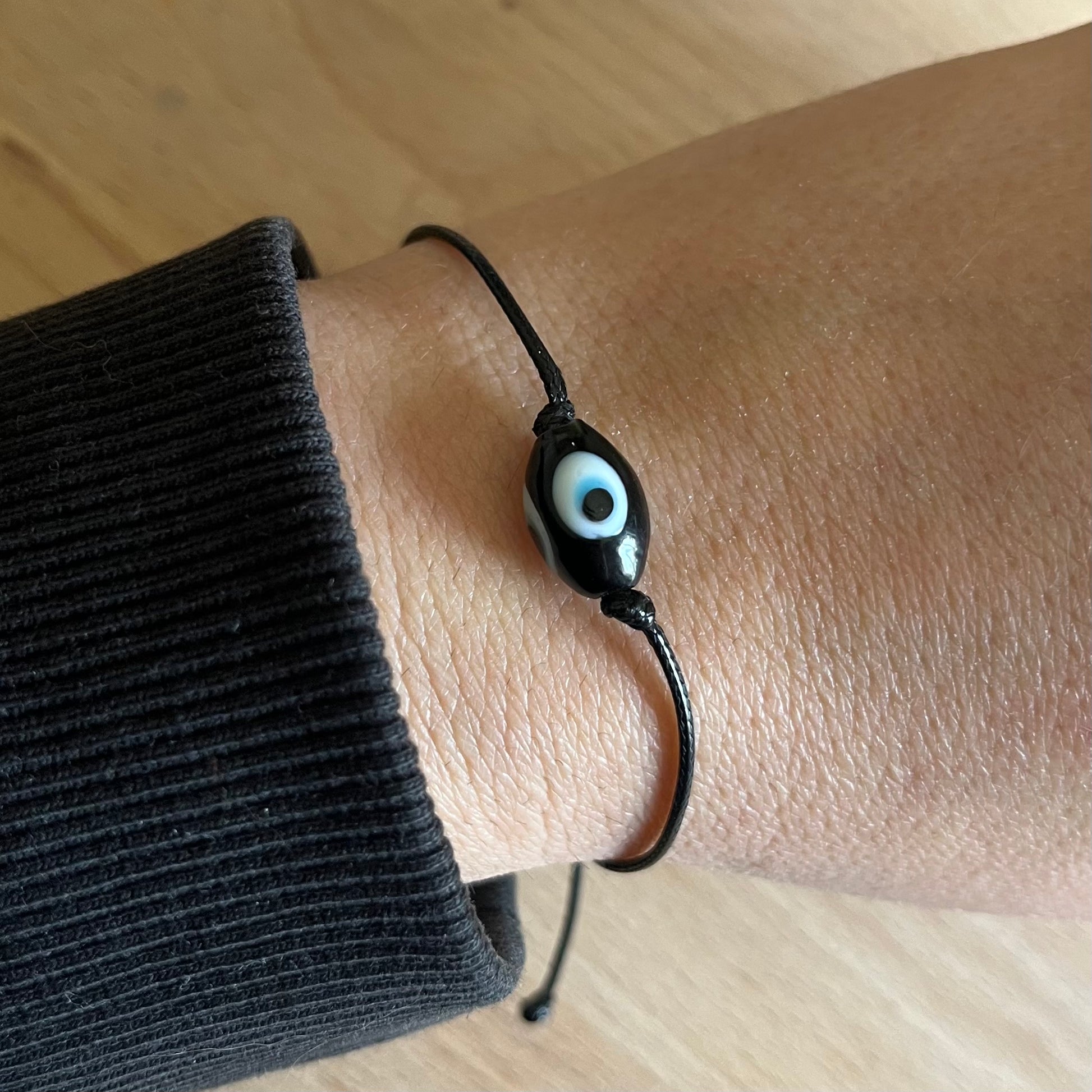 MADE WITH: Handcrafted by us with love and intention, this bracelet features a 1.5cm black evil eye bead on a black adjustable cord bracelet.