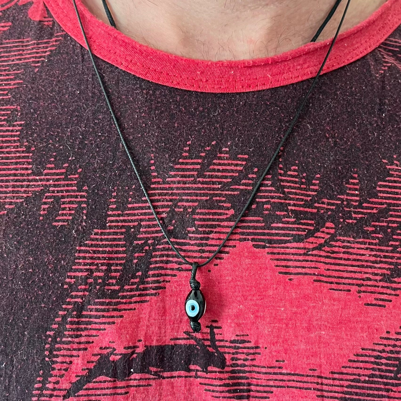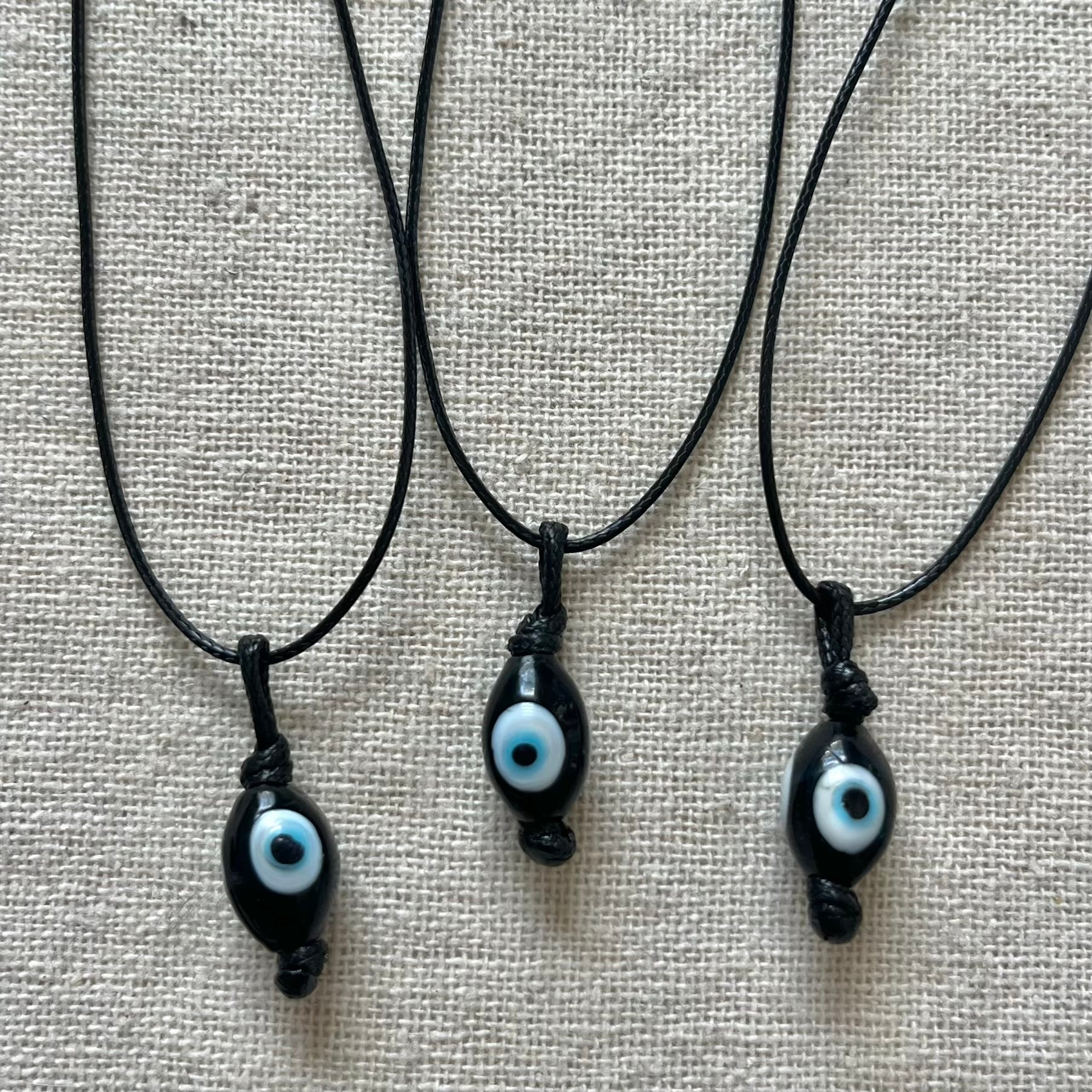 MADE WITH: A black 1.5cm evil eye pendant strung on a 33 inch adjustable black cord to suit your preferred length.