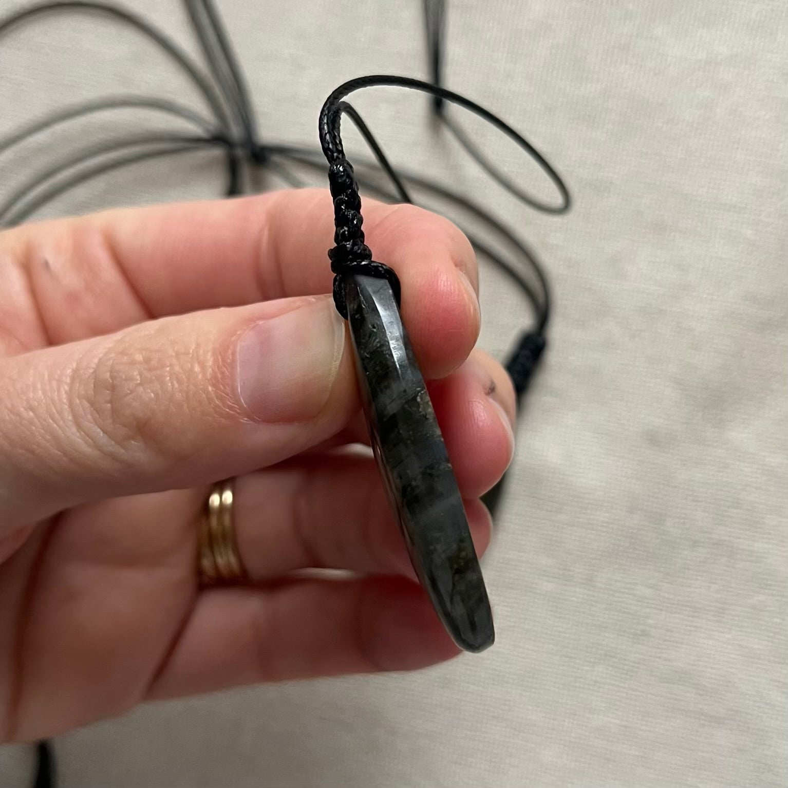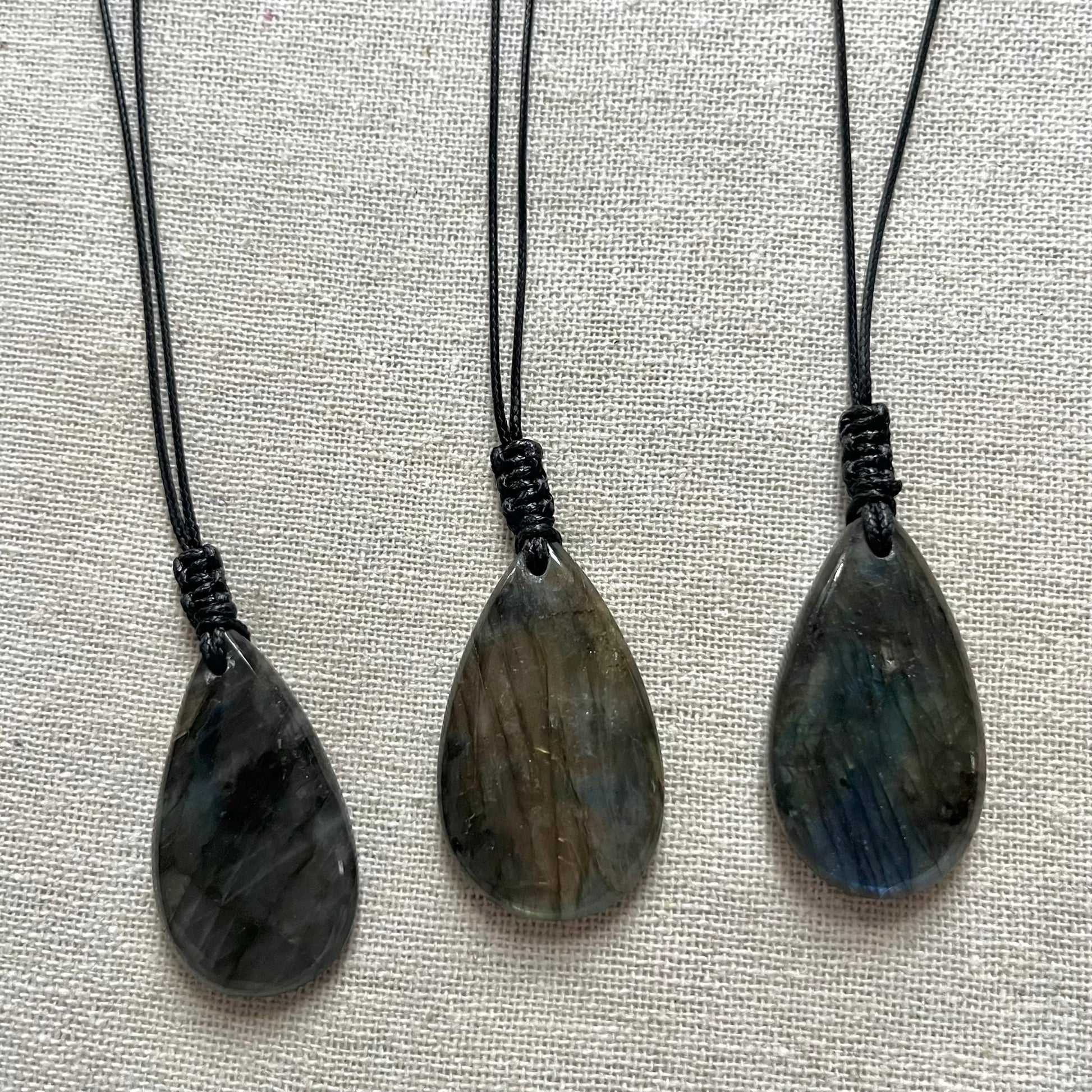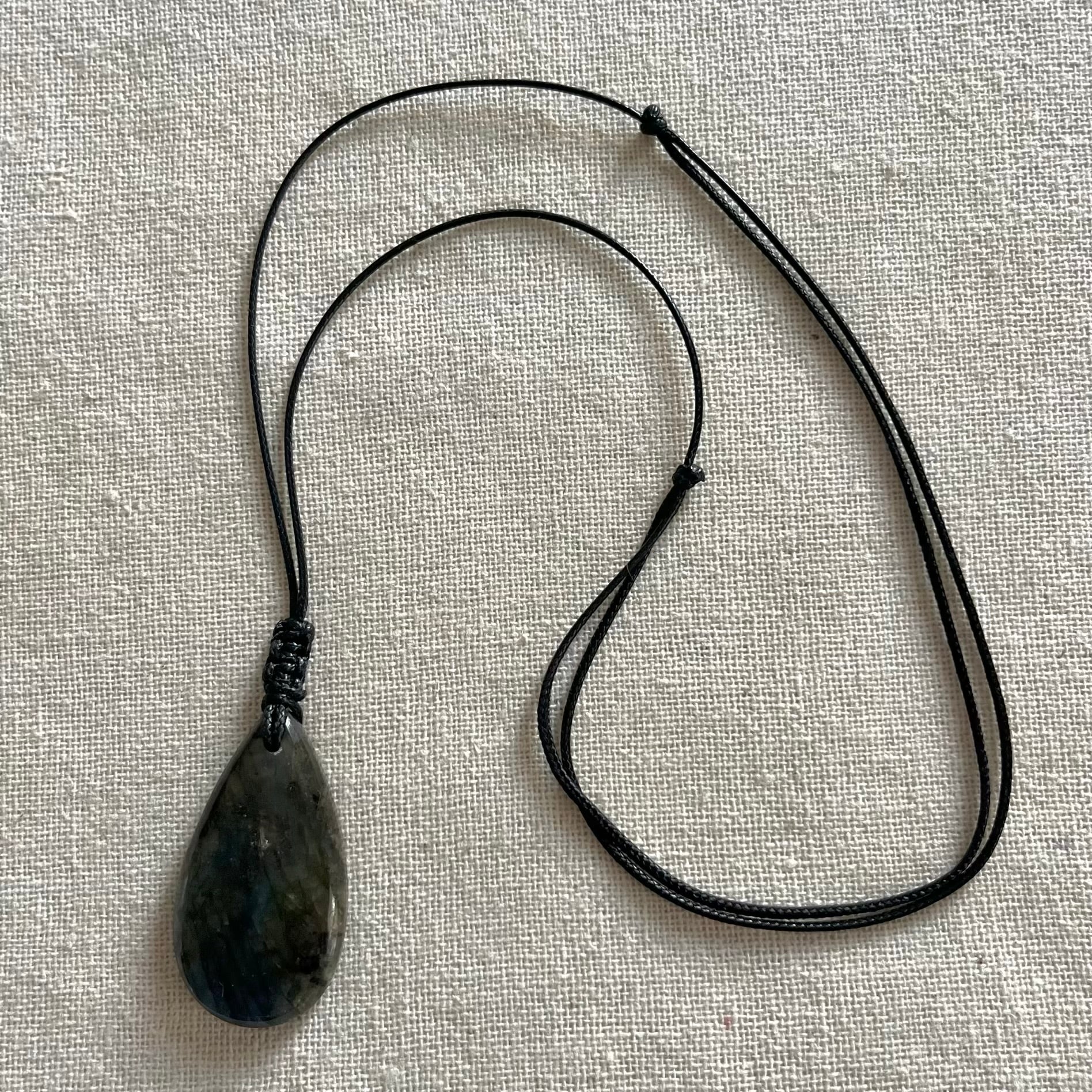 MADE WITH: A high grade teardrop Labradorite pendant approx 3.5cm in size on an adjustable 33inch black cord necklace. This pendant makes a mystical everyday piece or a thoughtful gift for anyone drawn to crystals of intuition and transformation.