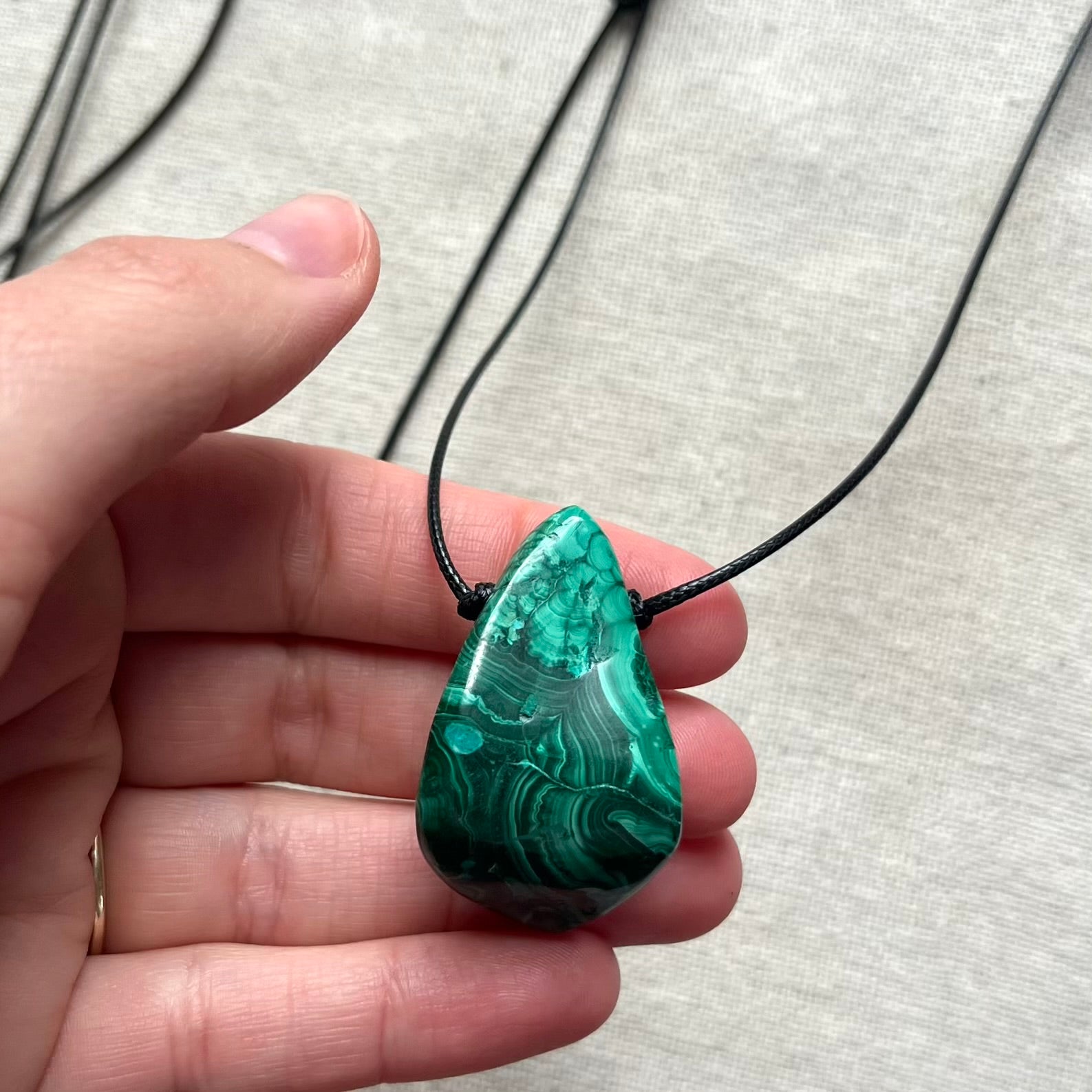 MADE WITH: A high grade polished Malachite pendant approx 3.5-4cm in size on an adjustable 33inch black cord necklace. This pendant makes a striking everyday piece or a meaningful gift for anyone drawn to crystals of transformation and abundance.