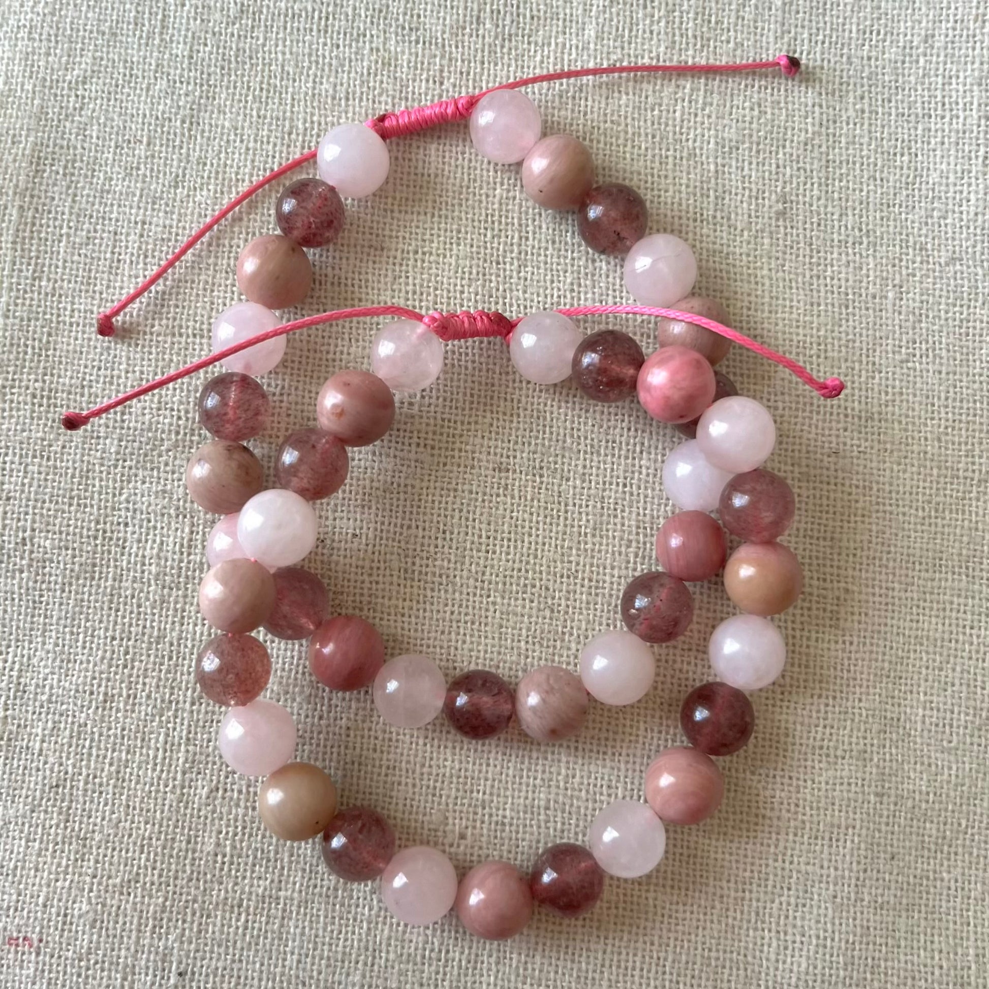 MADE WITH: Handcrafted by us with love and intention, this bracelet features high-quality, natural 8mm Rose Quartz, Strawberry Quartz and Rhodonite beads on a pink adjustable cord bracelet.